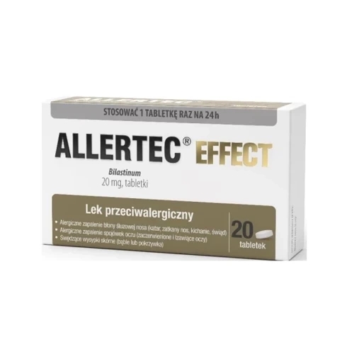 Allertec Effect 20mg to produkt leczniczy, którego substancją czynną jest bilastyna. Jest to lek o działaniu przeciwhistaminowym, wskazany do łagodzenia objawów alergicznych w obrębie nosa, oczu oraz skóry. Do stosowania powyżej 12. roku życia.