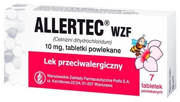 Allertec WZF jest lekiem zawierającym ceteryzynę - substancję o skutecznym działaniu łagodzącym reakcje alergiczne organizmu. Lek wskazany w przebiegu alergicznego zapalenia błon śluzowych nosa oraz spojówek, oraz w pokrzywce idiopatycznej.