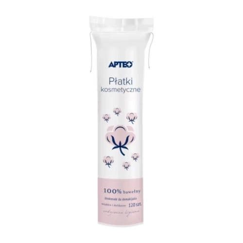 Apteo Płatki kosmetyczne to produkt przeznaczony do stosowania w celach kosmetycznych. Polecane są w codziennej pielęgnacji skóry twarzy, szyi i dekoltu. Płatki wykonane są w 100% z bawełny. Opakowanie zawiera 120 jednorazowych płatków.