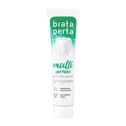 Biała Perła Multi Perfekt to pasta do zębów z fluorem i hydroksyapatytem. Zapewnia ona kompleksową higienę i ochronę jamy ustnej. Skutecznie wspiera remineralizację i odbudowę szkliwa, chroni przed próchnicą, a także działa delikatnie wybielająco.