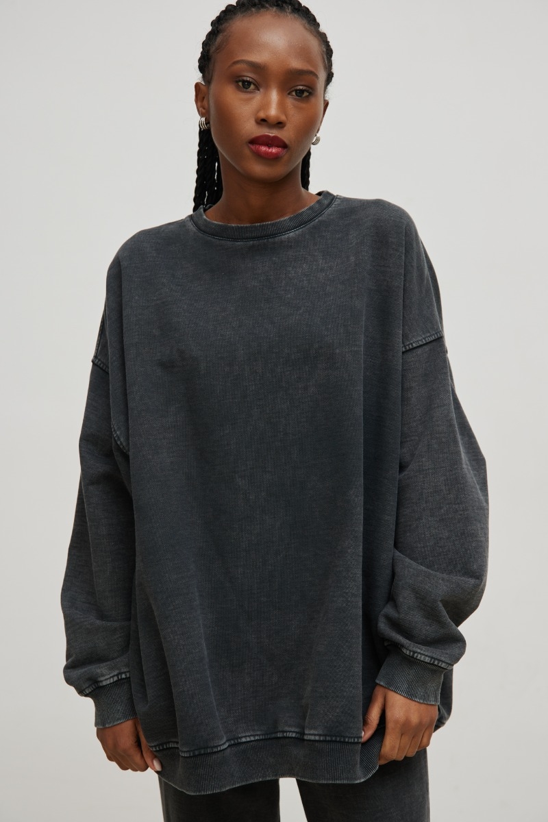 Bluza damska o kroju oversize wykonana z dzianiny dresowej w kolorze spranej szarości. Ten model wykonany jest z dzianiny diagonalnej ,dzieki czemu materiał idealnie trzyma formę . Bluza z długim rękawem, półokrągłym dekoltem . Dół bluzy oraz rękawy wykończone ściągaczem . Tył oraz przód bluzy zupełnie gładki . Pasuje do niemalże każdego typu sylwetki. Możesz nosić ją na wiele sposobów - delikatnie wpuszczoną w szorty, czy spodnie, ale także w luźnej wersji np. do leginsów. Basic, który pokochasz za wygodę i jakość oraz oryginalną kolorystykę. Model został poddany dodatkowej obróbce , tj farbowaniu białej dzianiny , oraz jej ponownym spieraniu , tak aby uzyskać finalny efekt . Dzięki temu ta bluza wyróżnia się spośród innych modeli. Zachwyci fanki nie banalnych stylizacji! Skład: 100% Bawełna ZALECANA PIELĘGNACJA: