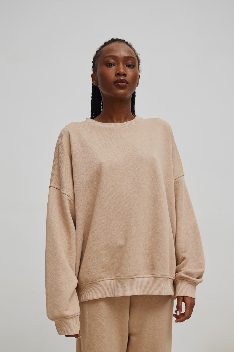 Damska bluza o luźnym kroju w kolorze beżowym . Fason o luźnym kroju z brzegami zakończonymi ściągaczem. Wykonana z nie ocieplonej dzianiny dresowej . Model o lekko obniżonej linii ramion. Fason z niewielkim, okrągłym dekoltem. Prosta, oversize'owa forma, która przypadnie do gustu wielbicielkom uniwersalnych i wielosezonowych produktów. Pozwala na dopasowanie do wielu typów sylwetek. Dostępna również w innych kolorach. Tworzy komplet ze spodniami DRIPS w tym samym kolorze . Skład: 90% bawełna, 10% poliester ZALECANA PIELĘGNACJA: