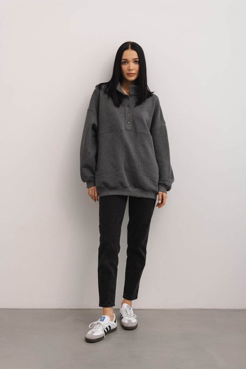 Bluza wykonana z dzianiny dresowej z ociepleniem w kolorze ciemnoszarym z efektem melanżu. . Model o klasycznym kroju . Dekolt w formie wysokiej stójki , zapinany na napy. Długie rękawy, oraz dół bluzy zakończone ściągaczem . Po bokach kieszonki , oraz charakterystyczne przeszycie po środku . Tył bluzy zupełnie gładki . Świetnie łączy się z jeansem lub klasycznymi sportowymi jogerami. Ten model wpisuje się w styl casual . Sprawdzi się zarówno w sezonie wiosenno -letnim oraz jesienno - zimowym . Idealny dla każdego typu sylwetki. Modelka ma 174cm wzrostu . Gramatura dzianiny: 300g Skład : 80% Bawełna 20% Poliester PRODUKT POLSKI - MARSALA COLLECTION ZALECANA PIELĘGNACJA: