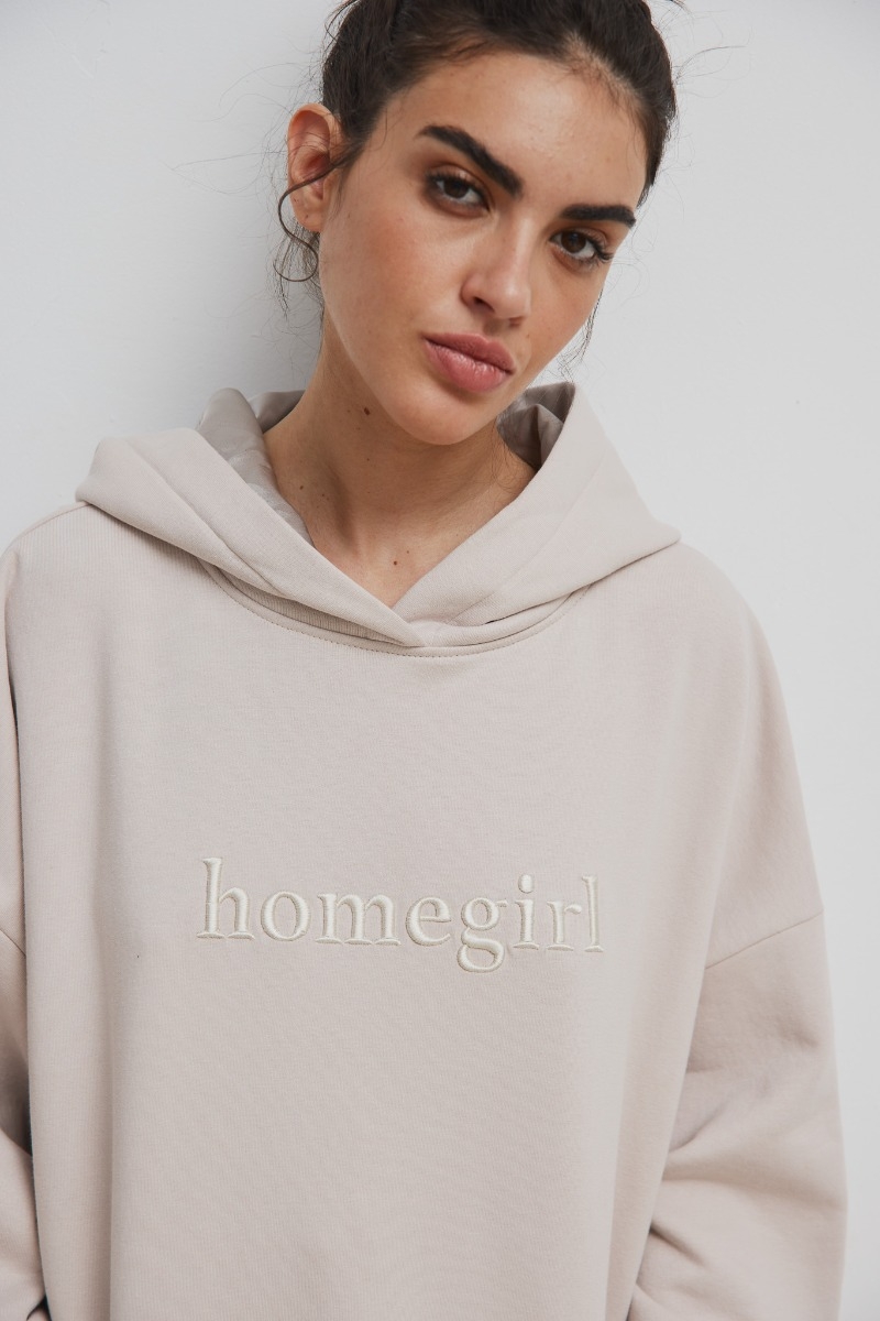 Luźna bluza typu overisize wykonana z wysokiej jakości ocieplanej dzianiny dresowej z kapturem w kolorze beżowym.. Fason o luźnym kroju, dół bluzy oraz rękawy wykończone ściągaczem . Posiada z przodu kieszonkę kangurkę oraz duży haft HOMEGIRL. Kaptur od środka został wykończony podszewką w kolorze bluzy . Zastosowanie takiego wykończenia ma na celu wygodę oraz komfort dla Twoich włosów . Przeznaczona przede wszystkim dla wielbicielek komfortu , które jednocześnie pragną podążać za najświeższymi trendami. Bluza świetnie tuszuje wszelkie niedoskonałości figury i zapewnia maksymalny komfort użytkowania. Połączysz ją z leginsami, dresami, jeansami, czy szortami! Dostępna również w innych kolorach . Skład: 90% Bawełna, 10% Poliester Wnętrze kaptura : 48% Wiskoza , 52% Poliester