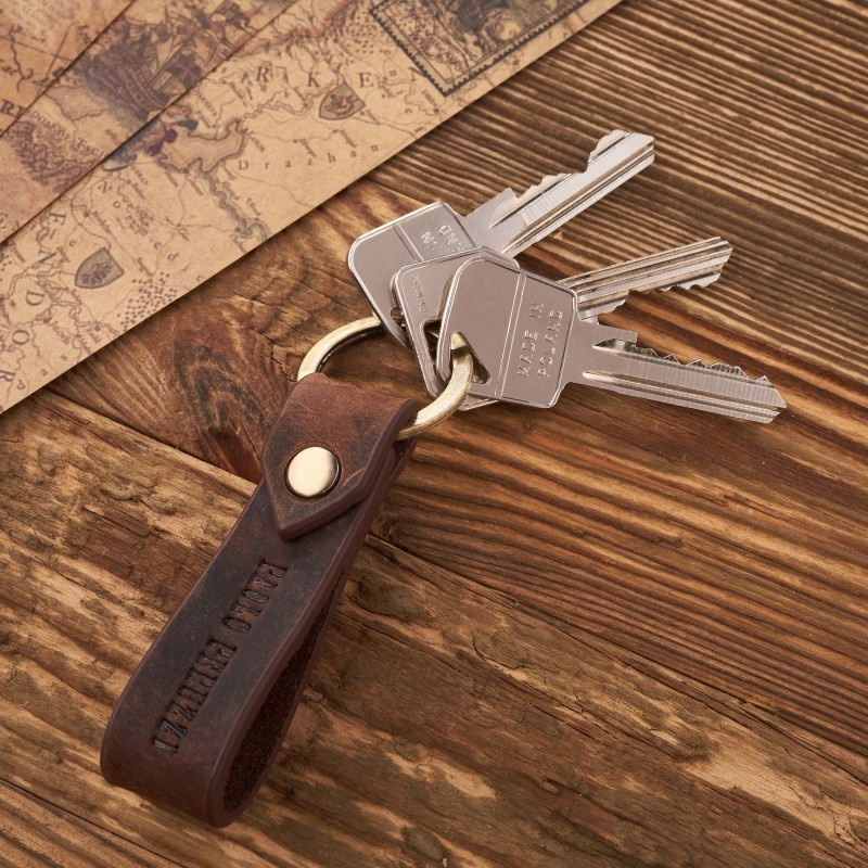 Breloczek T–87 wykonano ze skóry naturalnej hunter o klasycznym, prostym designie. Brelok wyposażono w solidne, sprężyste kółko w kolorze złotym, na którym z łatwością zamocujesz klucze. Tłoczone logo producenta jest potwierdzeniem wysokiej jakości wykonania breloczka.