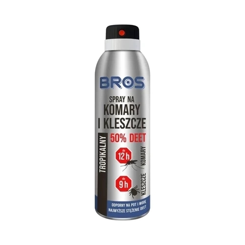Preparat z bardzo wysokim stężeniem DEET oraz dodatkiem geraniolu! Bros 50% DEET płyn komary i kleszcze zapewnia długotrwałą ochronę – do 12 godzin przed komarami, do 10 godzin przed komarami tropikalnymi i meszkami oraz do 9 godzin przed kleszczami.