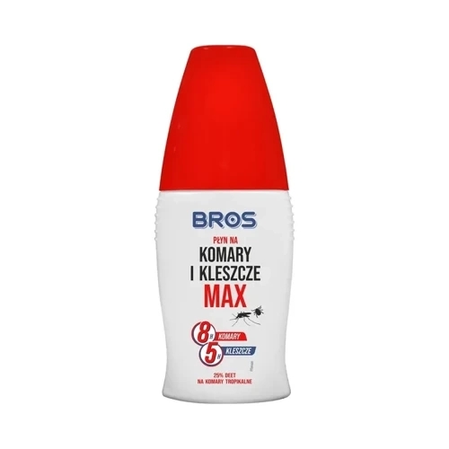 Bros Max płyn komary kleszcze to skuteczny środek do ochrony przed komarami i kleszczami. Preparat zawiera DEET. Po aplikacji skóra jest zabezpieczona przed komarami (także tropikalnymi) nawet do 8 godzin, natomiast przed kleszczami – do 5 godzin.