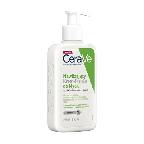 Cerave Nawilżający krem-pianka do mycia skutecznie usuwa zanieczyszczenia, sebum i makijaż. Dodatkowo nawilża oraz wzmacnia barierę ochronną skóry. Kosmetyk jest rekomendowany do codziennego oczyszczania cery normalnej, suchej oraz wrażliwej.