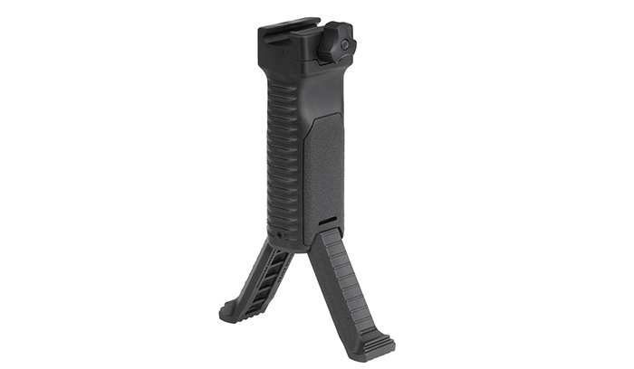Chwyt przedni posiadający wysuwany dwójnóg. Wykonany z lekkiego i wytrzymałego polimeru. Prosty mechanizm sprężynowy umożliwia szybkie rozłożenie dwójnogu, poprzez ściśnięcie jego spodu i pociągnięcie go. Montaż Picatinny, blokowany śrubą QD. Zajmuje niewiele miejsca na szynie, dzięki czemu można go dowolnie konfigurować z pozostałymi akcesoriami. Cechy: Smukły i wygodny pionowy chwyt przedni Prosty, sprężynowy mechanizm dwójnogu Teksturowanie na froncie i tyle oraz powierzchnie antypoślizgowe na bokach Nachylenie pod kątem 89° Montaż na szynie 1913 Picatinny Śruba QD z trzyramiennym pokrętłem Wykonany z wytrzymałego i lekkiego polimeru Dane techniczne WysokośćZłożony: 116 mm