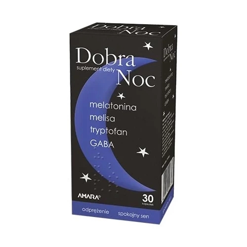 Suplement diety Dobra Noc polecany jest dla osób dorosłych. Przeznaczony jest do stosowania jako uzupełnienie codziennej diety w składniki wspierające zasypianie. Preparat zawiera melatoninę, kwas GABA, L-tryptofan oraz ekstrakty z melisy i kozłka.