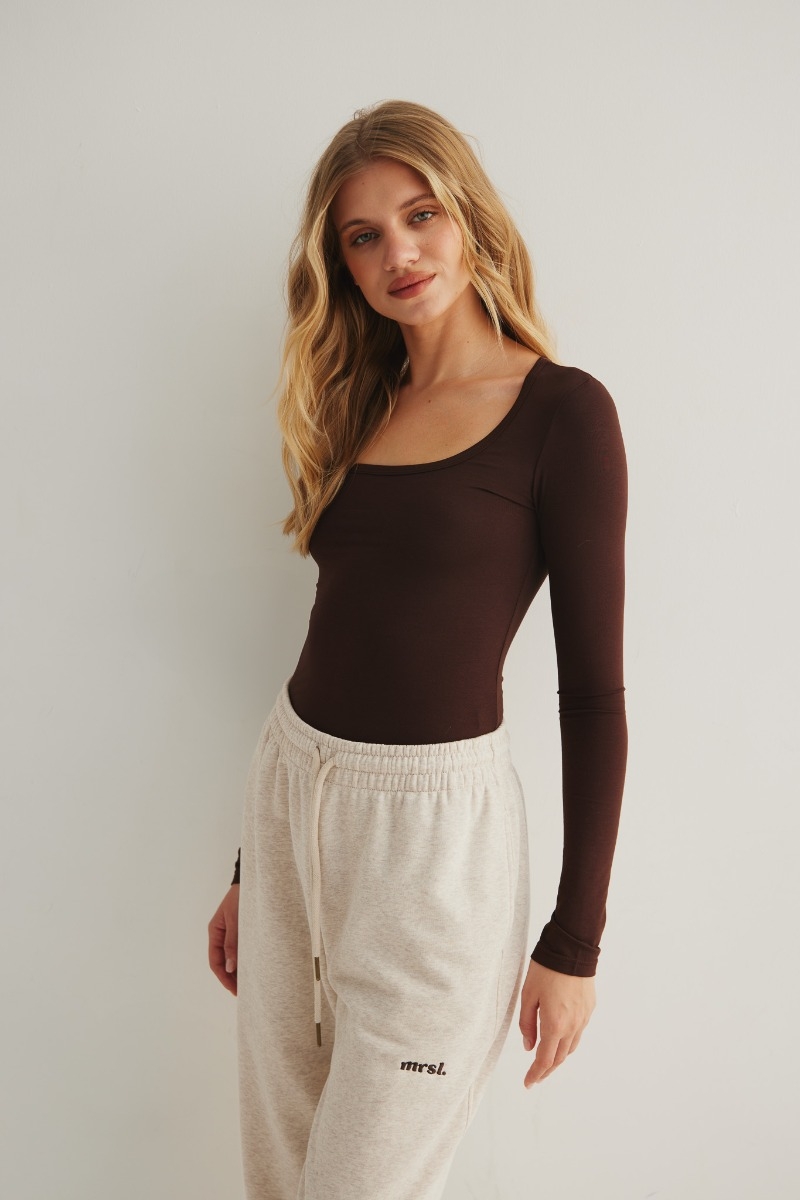 Damska bluzka wykonana z delikatnej dzianiny w kolorze brązowym. Fason o dopasowanym kroju z długim rękawem oraz głębszym półokrągłym dekoltem. Bardzo kobiecy detal który pozwoli wyeksponować biust Niezaprzeczalny atut modelu stanowi przyjemny w dotyku, elastyczny oraz wysokiej jakości materiał, który pozwala na doskonałe dopasowanie do sylwetki. Jeden z produktów, które stanowią idealną bazę do stworzenia niemalże każdej stylizacji. Skład: 80% Modal, 20% Poliester Zastrzegamy prawo do różnicy w podanych wymiarach na stronie pomiędzy 1-2 cm , wynikającej z kurczliwości tego typu dzianiny.