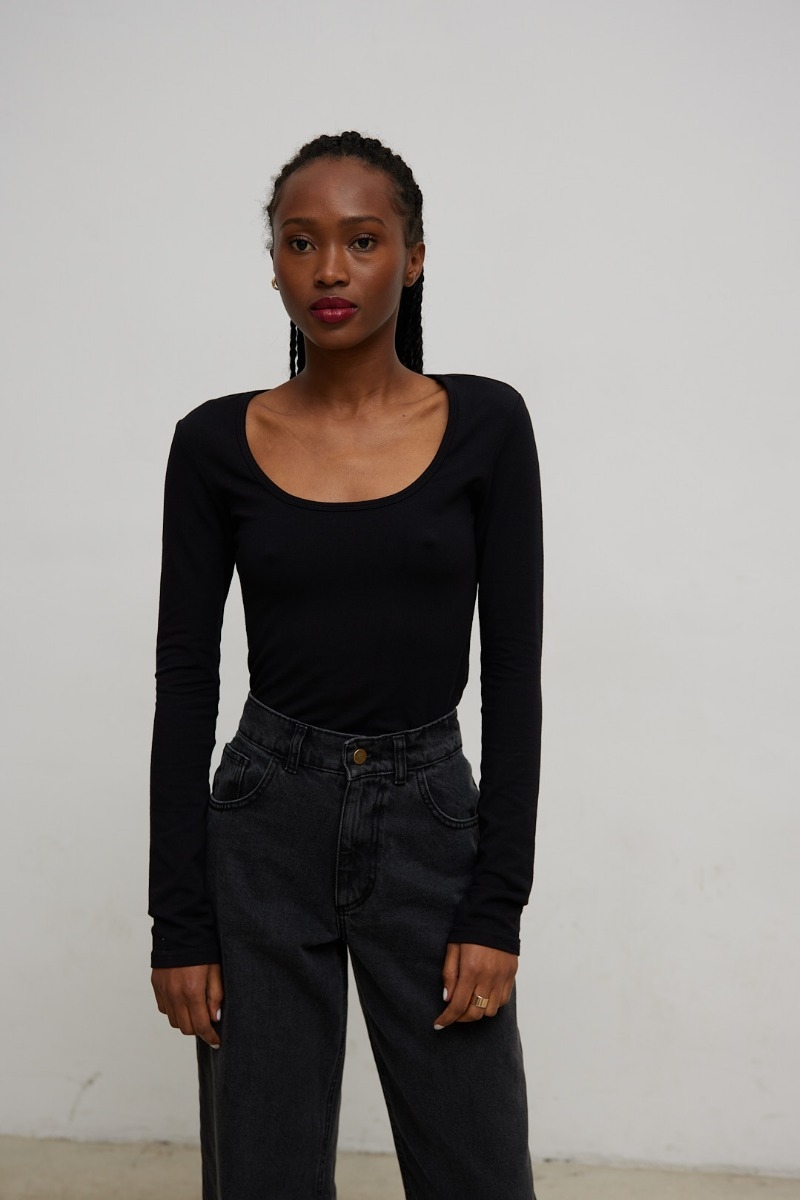 Damska bluzka wykonana z delikatnej dzianiny w kolorze czarnym. Fason o dopasowanym kroju z długim rękawem oraz głębszym półokrągłym dekoltem. Bardzo kobiecy detal który pozwoli wyeksponować biust Niezaprzeczalny atut modelu stanowi przyjemny w dotyku, elastyczny oraz wysokiej jakości materiał, który pozwala na doskonałe dopasowanie do sylwetki. Jeden z produktów, które stanowią idealną bazę do stworzenia niemalże każdej stylizacji. Skład: 48% Wiskoza , 47% Bawełna, 5% Elastan Zastrzegamy prawo do różnicy w podanych wymiarach na stronie pomiędzy 1-2 cm , wynikającej z kurczliwości tego typu dzianiny. ZALECANA PIELĘGNACJA:
