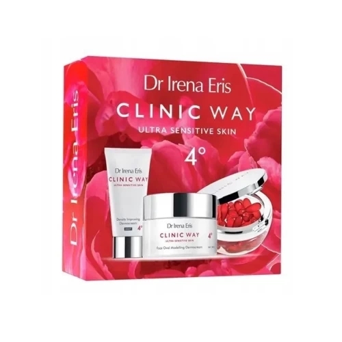Dr Irena Eris Clinic Way 4° Krem na dzień + Krem na noc + Dermokapsułki to trzy kosmetyki dedykowane kobietom od około 60. roku życia. Zapewniają one pielęgnację wrażliwej skóry z widocznymi głębokimi zmarszczkami i zmienionym owalem twarzy.