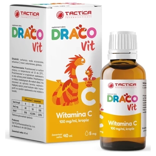 Suplement diety Dracovit Witamina C krople przeznaczony jest do stosowania w celu uzupełnienia codziennej diety w kwas L-askorbinowy, czyli witaminę C. Można stosować zarówno u niemowląt, jak i u starszych dzieci, młodzieży oraz osób dorosłych.