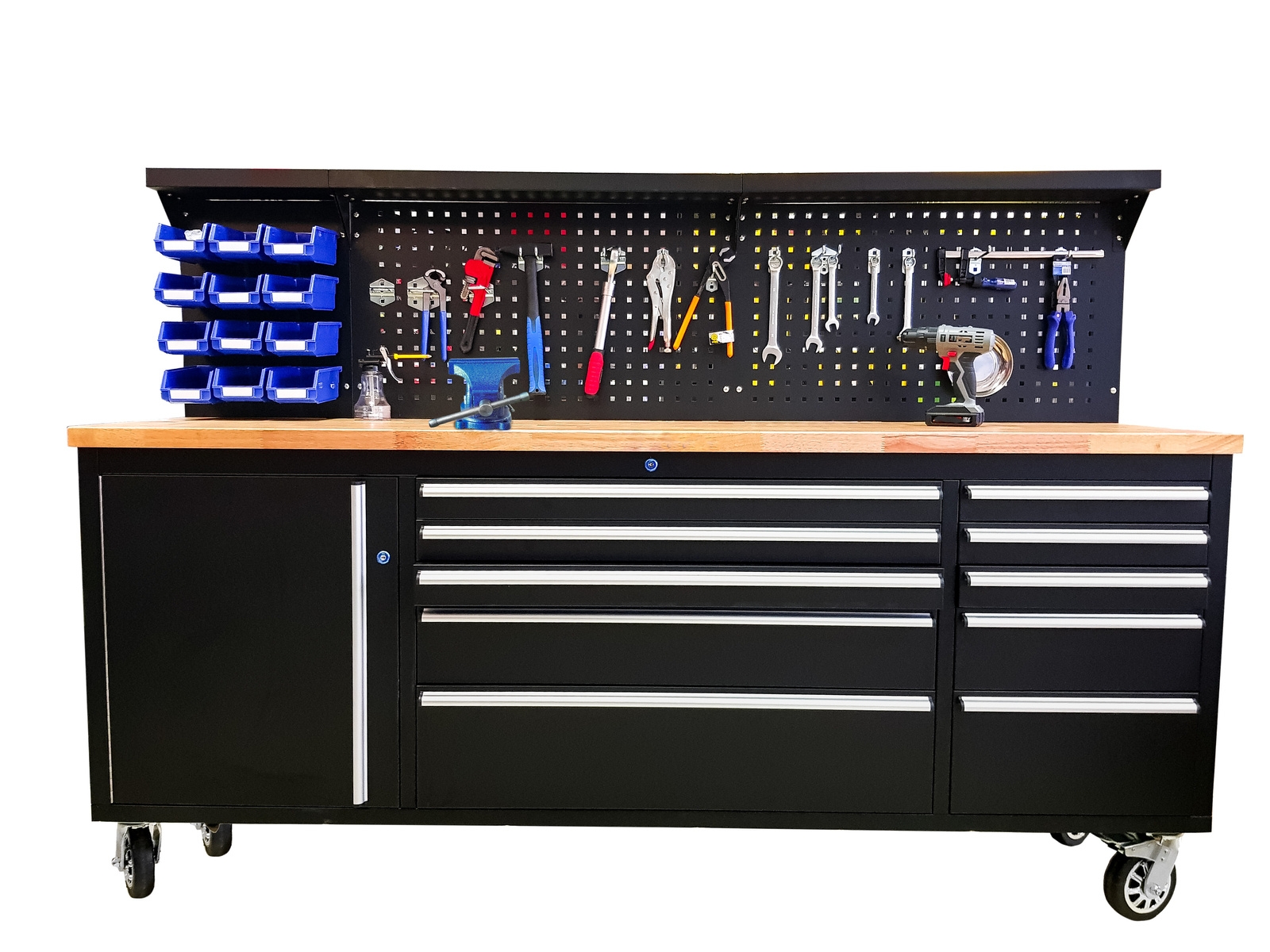 DUŻY STÓŁ WÓZEK WARSZTATOWY Z DREWNIANYM BLATEM, SZAFKĄ ORAZ SZUFLADAMI WMC