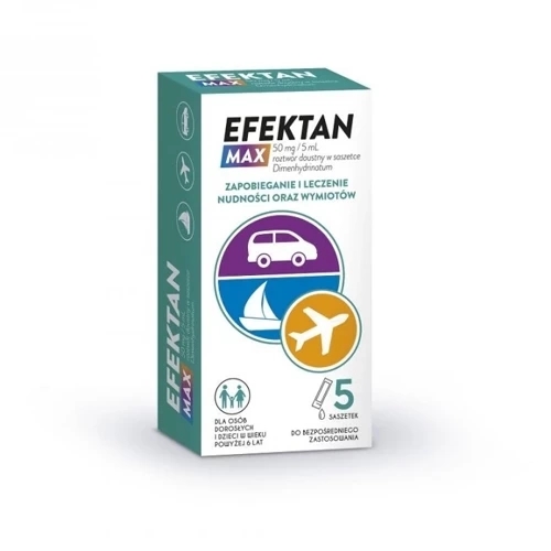 Substancją czynną produktu leczniczego Efektan Max roztwór doustny jest dimenhydramina. Działa ona przeciwwymiotnie, przeciwuczuleniowo oraz łagodnie uspokajająco. Lek jest wskazany do stosowania m.in. w zapobieganiu chorobie lokomocyjnej.