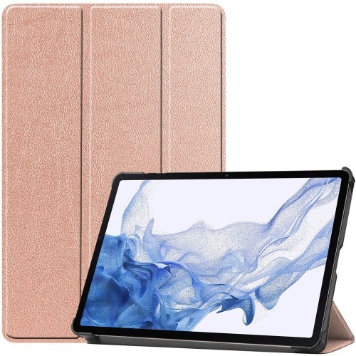 Bizon Case Tab Croc Samsung Galaxy Tab S8 (SM-X700, SM-X706)Samsung Galaxy Tab S7 (SM-T870, SM-T875, SM-T876B)   Zapobiegnij serii niefortunnych zdarzeń Krokodyle są z nami już od 83,5 mln lat i zamieszkują głównie niziny tropikalne, a teraz także magazyny Bizona! Etui od producenta Bizon z serii Tab Croc ochroni Twój tablet przed zabrudzeniami, zarysowaniami i drobnymi upadkami i przyjmie na klatę (plecy) codzienne przeciwności losu, takie jak kropelki kawy bombardujące tył tabletu, MMA z kluczami w plecaku czy pospieszne odłożenie urządzenia AKURAT na krawędź blatu. Kolor producenta: Rose Gold Etui kompatybilne ze szkłami* o wymiarach nieprzekraczających (dług./szer./przek.): 25,27 x 16,35 x 29,44 cm *Przy doborze ochrony ekranu zwróć uwagę, aby szkło było mniejsze niż wymiary wewnętrzne pokrowca.   Etui z klapką wyreżyserowane przez Bizona Boisz się, że po założeniu etui, tablet zamieni się w krokodyla i ucieknie do Australii? Tak jest tylko na filmach. A Bizon Tab Croc, oprócz hybrydowej konstrukcji z twardego plastiku na pleckach i ramce oraz skóry syntetycznej od zewnątrz, cechuje się wyjątkowo smukłą i lekką budową, nijak nieprzypominającą topornego archozaura! Wzmocnione narożniki załagodzą nieco Twój szok i impet uderzenia, a ukryta w środku pokrowca mikrofibra dodatkowo otuli i zabezpieczy urządzenie.   Proszę wstać, Tab Croc idzie Może i nie nadaje się jako papier origami, ale odpowiednio złożony pokrowiec zamieni się w podstawkę, dzięki której pod kątem 65 lub 30 stopni wygodnie obejrzysz program przyrodniczy czy napiszesz artykuł na temat gadów. Tablet nie człowiek, skąd ma wiedzieć, kiedy się położyć i wstać? Dzięki funkcji automatycznego wybudzania i usypiania*! Uniesienie klapki aktywuje urządzenie, a zamknięcie - powie mu “dobranoc”. *Kompatybilna z wybranymi modelami tabletów.