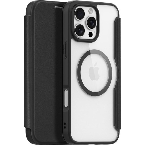 Etui Dux Ducis Skin X Pro Magnetic Apple iPhone 16 Pro   Magnetyczne etui z klapką Etui z klapką od marki Dux Ducis z serii Skin X Pro Magnetic to wykonany z ekologicznej skóry stylowy dodatek, który zapewni nie tylko ochronę urządzenia, ale ułatwi również codzienną organizację.  Kolor producenta: Black (czarno-przezroczysty) Etui kompatybilne ze szkłami o wymiarach mniejszych niż (długość x szerokość): 14,72 x 6,89 cm *Przedmiotem sprzedaży jest samo etui, pozostałe akcesoria widoczne na zdjęciach służą jedynie przedstawieniu jego funkcjonalności.   Ochrona z każdej strony Skóra ekologiczna wsparta wewnętrzną, odporną na wstrząsy warstwą z TPU skutecznie chroni smartfon z każdej strony. Etui chroni telefon ze wszystkich stron przed zarysowaniami i zabrudzeniami, a zintegrowane osłony przycisków blokują drogę wtargnięcia brudowi czy drobinom piasku. Gładka powierzchnia jest odporna na powstawanie odcisków palców, dzięki czemu obudowa zawsze pozostaje czysta i schludna!   Praktyczny schowek W środku etui znajdują się przegrody na karty kredytowe, dokumenty lub banknoty, dzięki czemu będziesz miał najważniejsze rzeczy zawsze pod ręką. Magnetyczne zamykanie zabezpiecza etui przed samoczynnym otwarciem, dlatego możesz być spokojny o bezpieczeństwo Twojego urządzenia.   Kompatybilność z MagSafe Wbudowany w etui magnetyczny pierścień zapewnia kompatybilność z akcesoriami MagSafe, co oznacza, że możesz korzystać ze swoich ulubionych akcesoriów bez potrzeby zdejmowania etui!