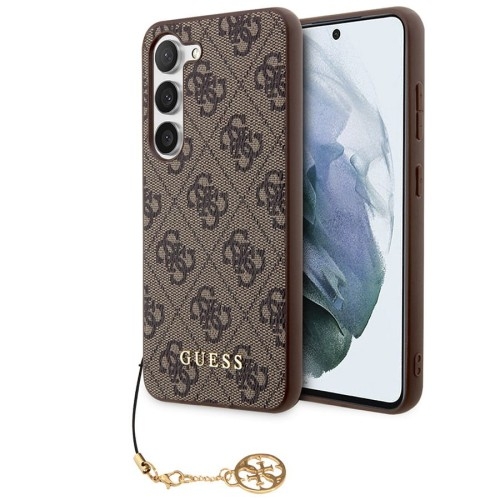 Etui Guess 4G Charms Collection Samsung Galaxy S24   Wyjątkowa kolekcja z klasycznym wzornictwem Amerykańska firma Guess od wielu lat jest utożsamiania z bardzo dobrą jakością i oryginalnym wzornictwem. Etui z kolekcji 4G Charms wyprodukowane przez firmę CG Mobile na oficjalnej licencji marki Guess jest pozycją dla osób ceniących sobie klasykę i styl. Zaprojektowane z wyjątkową starannością o szczegóły. Wykonane z połączenia przyjemnego w dotyku i twardego poliwęglanu na pleckach oraz elastycznego termopoliuretanu, z którego wykonana została ramka. Pokryte materiałową fakturą Saffiano, która nadaje luksusowego wyglądu. Kolor producenta: Brown (brązowy) Etui kompatybilne ze szkłami o wymiarach mniejszych niż (dług./szer.): 14,53 x 6,93 cm Przedmiotem sprzedaży jest samo etui, pozostałe akcesoria widoczne na zdjęciach służą jedynie przedstawieniu jego funkcjonalności.   Ochrona tyłu i boków Dobrze dopasowane etui, zachowuje opływowe kształty smartfona. Plecki i boki telefonu są skutecznie zabezpieczone przed zarysowaniami, zabrudzeniem oraz wstrząsami.   Wciąż tak samo funkcjonalne Precyzyjne wycięcia zapewniają pełen dostęp do interfejsów i portów, bezpiecznie leżąc w dłoni. Staranne wykończenie oraz zintegrowane osłony przycisków utrzymują nowoczesny i minimalistyczny design. Pewnie leży w dłoni oraz łatwo się zakłada.   Przyjemne dla oka dodatki Zewnętrzny wzór 4G, logo Guess w złotym kolorze i przyczepiona subtelna zawieszka - wszystkie te detale razem nadadzą niepowtarzalnego stylu Twojemu urządzeniu, tworząc połączenie kultowych dodatków Guess.
