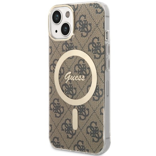 Etui Guess Hardcase 4G MagSafeApple iPhone 14 Koncept domu mody GuessTo stylowe etui z kolekcji Hardcase 4G MagSafe to prawdziwy klejnot wśród akcesoriów dla posiadaczy iPhone'ów. Jego charakterystyczny wzór 4G to rozpoznawalny na całym świecie motyw marki Guess, którego elementy zawsze kojarzą się z najwyższą jakością i eleganckim stylem. Stworzony z połączenia elastycznego TPU wraz z twardym i wytrzymałym poliwęglanem. Cover przeznaczony dla osób, którym zależy na znanym logo i dobrej ochronie przed zarysowaniem, zabrudzeniami i lekkimi wstrząsami.Pokrowiec kompatybilny z MagSafe.Kolor producenta: BrownEtui kompatybilne ze szkłami o wymiarach nieprzekraczających (dług./szer./przek.): 14,39 x 6,90 x 15,32 cm Ochrona tyłu i bokówDobrze dopasowane etui, zachowuje opływowe kształty smartfona. Plecki i boki telefonu są skutecznie zabezpieczone przed zarysowaniami, zabrudzeniem oraz wstrząsami.Case posiada elastyczne boki i delikatnie twardsze plecki, co wspólnie tworzy doskonały balans pomiędzy skuteczna ochroną urządzenia i modnym wyglądem. Funkcjonalność etui z magnetycznym pierścieniem MagSafeCover zapewnia pełen dostęp do interfejsów dzięki zintegrowanym i starannie wykończonym osłonom na przyciski oraz wycięciom na porty. Kompatybilny z funkcją MagSafe. Wbudowany wewnątrz magnetyczny pierścień pozwoli na użytkowanie Twojego telefonu wraz z produktami z serii MagSafe bez wyciągania go z etui. Magnesy są świetnie dopasowane do urządzenia i zapewniają mocne przyleganie telefonu do ładowarki. Ekskluzywne wzornictwo wraz z wysoką jakościąDodatkowo, złote dodatki w postaci ramki wokół aparatu i emblematu marki Guess nadają całemu etui elitarnego charakteru. Jeśli szukasz funkcjonalnego i jednocześnie ekskluzywnego etui do swojego smartfona, to kolekcja 4G MagSafe marki Guess to propozycja dla Ciebie. To połączenie najnowszych trendów modowych z klasycznym stylem, które sprawi, że Twój telefon będzie piękną ozdobą, idealnie pasującą do Twojego codziennego outfitu.