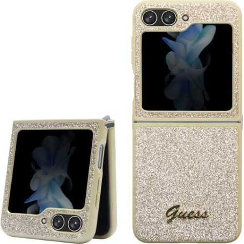 Etui Guess Hardcase Glitter Script Samsung Galaxy Z Flip5   Wyjątkowa kolekcja z klasycznym wzornictwem Amerykańska firma Guess od wielu lat jest utożsamiania z bardzo dobrą jakością i oryginalnym wzornictwem. Etui z kolekcji Hardcase Glitter Script wyprodukowane przez firmę CG Mobile na oficjalnej licencji marki Guess jest pozycją dla osób ceniących sobie klasykę i styl.  Zaprojektowane z wyjątkową starannością o szczegóły. Wykonane z połączenia przyjemnego w dotyku i twardego poliwęglanu na pleckach oraz elastycznego termopoliuretanu, z którego wykonana została ramka.  Pokryte błyszczącym brokatem. Kolor producenta: Gold Przedmiotem sprzedaży jest samo etui, pozostałe akcesoria widoczne na zdjęciach służą jedynie przedstawieniu jego funkcjonalności.   Ochrona tyłu i boków Dobrze dopasowane etui, zachowuje opływowe kształty smartfona. Plecki i boki telefonu są skutecznie zabezpieczone przed zarysowaniami, zabrudzeniem oraz wstrząsami.   Wciąż tak samo funkcjonalne Precyzyjne wycięcia zapewniają pełen dostęp do interfejsów i portów, bezpiecznie leżąc w dłoni. Staranne wykończenie oraz zintegrowane osłony przycisków utrzymują nowoczesny i minimalistyczny design. Case pewnie leży w dłoni oraz łatwo się zakłada.   Przyjemne dla oka dodatki Wykończenie pokrowca popularnym motywem błyszczącego brokatu oraz złotym logo marki Guess sprawia, że etui stanowi świetny dodatek uzupełniający Twój codzienny styl, doskonale komponując się z resztą Twoich stylowych akcesoriów modowych.