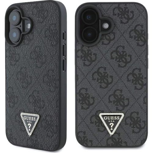 Etui Guess HardCase Leather 4G Triangle Strass Apple iPhone 16   Wyróżnij się z Guess! Amerykańska firma Guess od wielu lat jest utożsamiania z bardzo dobrą jakością i oryginalnym wzornictwem. Etui z kolekcji Leather 4G Triangle Strass wyprodukowane przez firmę CG Mobile na oficjalnej licencji marki Guess jest pozycją dla osób ceniących sobie klasykę i styl. Zaprojektowane z wyjątkową starannością o szczegóły. Wykonane z połączenia przyjemnego w dotyku i twardego poliwęglanu na pleckach oraz elastycznego termopoliuretanu, z którego wykonana została ramka. Pokryte materiałową fakturą Saffiano, która nadaje luksusowego wyglądu. Kolor producenta: Black (czarny) Etui kompatybilne ze szkłami o wymiarach mniejszych niż (dług./szer.): 14,47 x 6,90 cm WAŻNE! Ze względu na wystające logo, nie będzie kompatybilne z bezprzewodowym ładowaniem. Przedmiotem sprzedaży jest samo etui, pozostałe akcesoria widoczne na zdjęciach służą jedynie przedstawieniu jego funkcjonalności.   Chroni i pięknie wygląda! Dobrze dopasowane etui, zachowuje opływowe kształty smartfona. Plecki i boki smartfona są zabezpieczone przed codziennymi zagrożeniami – zarysowaniami, zabrudzeniami i wstrząsami. Dzięki temu Twój telefon jest chroniony, a Ty możesz cieszyć się jego perfekcyjnym wyglądem na dłużej.   Idealny dostęp! Precyzyjnie wykonane wycięcia idealnie dopasowują się do portów i interfejsów, dzięki czemu masz pełen dostęp do wszystkich funkcji swojego smartfona. Case jest niezwykle łatwy w montażu, a ergonomiczny kształt sprawia, że doskonale leży w dłoni, zapewniając pewny chwyt i komfort podczas codziennego użytkowania.   Prestiżowy akcent! Popularny motyw 4G w połączeniu z eleganckim, połyskującym logo Guess nadaje luksusowego charakteru, który podkreśli Twój gust. To idealne uzupełnienie codziennych stylizacji, które płynnie komponuje się z Twoimi modnymi dodatkami, dodając im odrobiny prestiżu.