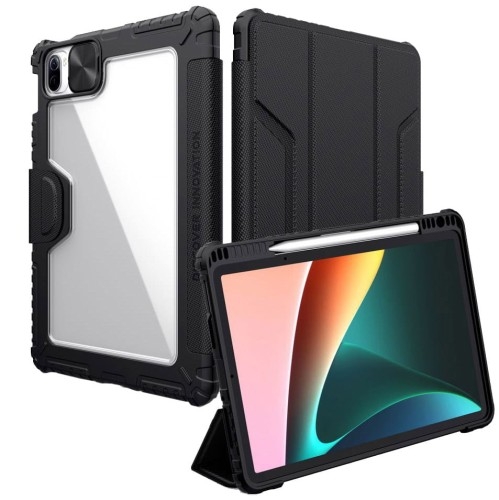 Etui Nillkin Bumper Xiaomi Pad 5 / Pad 5 Pro Materiał najwyżej jakości Pancerne etui od marki Nillkin z serii Bumper. Wykonane z wysokiej jakości tworzyw sztucznych, sztywnego poliwęglanu i elastycznego TPU. Etui kompatybilne ze szkłami o wymiarach nie przekraczających (szer./dług/przek.): 24,98 x 16,17 x 29,09 cm Kolor producenta: Black Pancerne i wytrzymałe Wysoka odporność na uderzenia i wstrząsy. Spełnia wojskowy standard odporności. Wzmocnione narożniki zapewniają ochronę w razie upadku. Zaprojektowane na podstawie zaawansowanej kompozytowej konstrukcji, dzięki czemu jest idealnie dopasowane i lekkie. Posiada ponadto specjalną osłonę na obiektyw. Ustawienie poziome Dzięki składanej klapce można ustawić urządzenie w pozycji poziomej i wygodnie pisać lub oglądać filmy czy seriale bez potrzeby trzymania urządzenia w rękach. Funkcjonalność Obudowa Nillkin Bumper posiada schowek na rysik, a także funkcję wybudzania i usypiania ekranu.