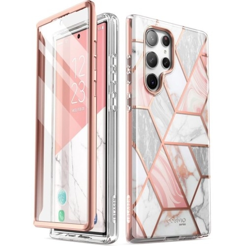 Etui Supcase i-Blason Cosmo with SP Samsung Galaxy S23 Ultra 5G Hybryda z olśniewającym wzornictwem Oryginalne etui od marki Supcase i-Blason z serii Cosmo wykonane z połączenia amortyzującego termopoliuretanu oraz mocnego poliwęglanu, przyciągające uwagę swoim fantastycznym wyglądem. Jego design charakteryzuje się bogatym i przepięknym wzornictwem, które niewątpliwie urozmaici wygląd Twojego smartfona. Obudowa posiada wbudowaną osłonę ekranu we frontowej ramce, zabezpieczając tym samym kompleksowo urządzenie. To cover o hybrydowej konstrukcji, który zapewnia doskonałe zabezpieczenie całego smartfona oferując solidną ochronę bez pancernych gabarytów. Kompozytowa budowa nie dodaje zbędnej wagi i zachowuje smukłość urządzenia. Wersja etui z wbudowaną osłoną wyświetlacza. UWAGA: To etui nakładamy bezpośrednio na samo urządzenie, które nie może mieć naklejonych żadnych dodatkowych folii ani szkła. Kolor producenta: Marble Pink (marmurowo-różowy) Z czego składa się Cosmo Budowa etui składa się z dwóch części: tylnych plecków przedniej ramki między które wkładamy telefon i składamy konstrukcję w jedną całość. Fascynujący i atrakcyjny design Design futerału cechuje się przepięknym i urozmaiconym wzornictwem, które z pewnością przyciągnie uwagę niejednego spojrzenia. Bogactwo wzorów i detali dekorujących to etui niewątpliwie uatrakcyjni wygląd Twojego telefonu. Zatem, jeśli szukasz czegoś ekstra, to Cosmo z powodzeniem zamaskuje monotonię Twojego urządzenia, dodając mu zdecydowanie olśniewającego i zjawiskowego stylu. Solidna odporność Obudowa oferuje wysoką ochronę przed wstrząsami spełniając normy wojskowego standardu odporności Mil-Grade. To świetny wybór, który sprawdzi się w codziennym użytkowaniu, a do tego zachowa smukły i stylowy kształt smartfona. Ranty ochronne Futerał posiada lekko wystające krawędzie chroniące kamerę i ekran przed zarysowaniami na płaskich powierzchniach, co pozwala na swobodne korzystanie np. z gestów wyciszania. Dowolnie odkładaj telefon na blat biurka bez obaw o porysowanie niezakrytych elementów. Funkcjonalny dostęp do interfejsów Precyzyjne wycięcia zapewniają swobodny dostęp do wszystkich interfejsów, oferując niezwykłą funkcjonalność i wygodę w użytkowaniu. Cover posiada także responsywne, zintegrowane osłony przycisków zachowujące dobrze wyczuwalne kliknięcie. Zastosowany materiał nie zakłóca ładowania bezprzewodowego - dotyczy modeli telefonów wyposażonych w tą technologię. Wygodnie leży dłoni Ergonomiczna konstrukcja zapewnia skuteczną ochronę przy minimalnych gabarytach oraz wadze, dzięki czemu etui jest lekkie, smukłe i dobrze leży w dłoni. Spójna i przemyślana całość sprawia, że telefon pewnie i bezpiecznie trzyma się w ręce. Warstwa klejąca w miejscu ekranowego czytnika W miejscu ekranowego czytnika linii papilarnych znajduje się warstwa klejąca, która pozwala na dokładne przyleganie zintegrowanej osłony ekranu w tym miejscu, w celu zwiększenia jego czułości dla prawidłowego skanowania odcisku palca. Należy mieć na uwadze, że to miejsce będzie się wizualnie odróżniać od pozostałej powierzchni ochrony wyświetlacza, która nie posiada kleju. UWAGA: Klej w miejscu ekranowego czytnika linii papilarnych jest jednorazowego użytku! Zdejmowanie osłony skutkuje zużyciem się warstwy klejącej i spadkiem jakości działania skanera linii papilarnych, uniemożliwiając jego poprawne działanie w przypadku ponownego montażu.