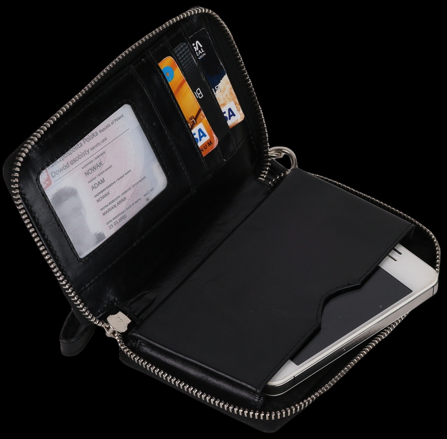 Etui-portfel na karty i dokumenty z praktyczną kieszenią na telefon. Wykonane z gładkiej skóry naturalnej najwyższej jakości. Etui wyposażone w zewnętrzną kieszonkę na suwak. W zestawie odpinana smyczka na nadgarstek.