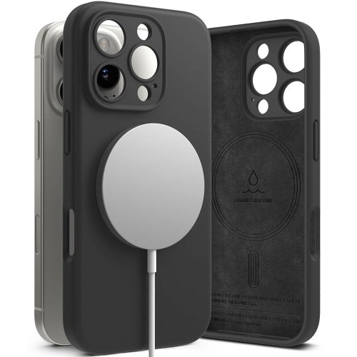 Ringke Silicone Magnetic Apple iPhone 16 Pro   Smukłe i wytrzymałe etui Nowe etui od producenta Ringke z serii Silicone Magnetic to niesamowicie cienkie i lekkie plecki dla Twojego smartfona! Wykonane zostało z delikatnego i wytrzymałego materiału o termoplastycznych właściwościach. Idealnie wpasowuje się w kształt telefonu, nie utrudniając przy tym dostępu do portów zewnętrznych i przycisków. Delikatnie podniesione krawędzie chronią przed zarysowaniami na powierzchniach płaskich. Umożliwia ładowanie bezprzewodowe bez zdejmowania obudowy! Kolor producenta: Black (czarny) Etui kompatybilne ze szkłami o wymiarach mniejszych niż (dług./szer): 14,67 x 6,90 cm Przedmiotem sprzedaży jest samo etui, pozostałe akcesoria widoczne na zdjęciach służą jedynie przedstawieniu jego funkcjonalności.   Obudowa przyjemna w dotyku Termo-wytrzymały silikonowy materiał gwarantuje przyjemne doznania w kontakcie z etui. Na dodatek zapewnia przy tym pewny chwyt. Smukłe i wygodne, etui gwarantuje jednocześnie wysoki poziom bezpieczeństwa, spełniając przy tym wojskowy standard odporności Military Grade!   Łatwy dostęp do interfejsów case'a Posiada zintegrowane osłony na przyciski i wycięcia na porty. Oferuje pełen dostęp do interfejsów, zapewniając najwyższy komfort użytkowania. Etui również chroni ekran oraz wyspę aparatu na płaskich powierzchniach dzięki podniesionym krawędziom. Po jednej stronie znajdują się specjalne wycięcia umożliwiające zamontowanie smyczy.   Ładowanie bezprzewodowe Plecki są tak skonstruowane, żeby nie zakłócać udogodnień takich jak ładowanie bezprzewodowe! Korzystaj z uśmiechem na twarzy!   Kompatybilne z MagSafe Wewnątrz etui znajduje się wbudowany pierścień magnetyczny zapewniający kompatybilność z akcesoriami MagSafe. Dzięki niemu nadal możesz korzystać z posiadanej ich gamy bez potrzeby zdejmowania pokrowca.