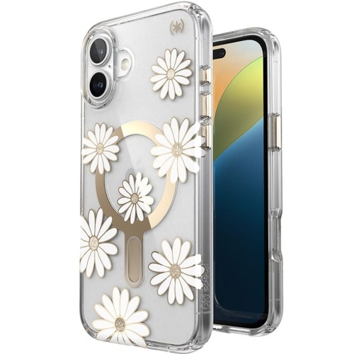 Speck Presidio Lux ClickLock & MagSafe Apple iPhone 16 Plus   Wzmocniona ochrona Szukasz etui, które zapewni Twojemu telefonowi nie tylko niezrównaną ochronę, ale również elegancki wygląd? Ten model z motywem stokrotek ozdobionym złotymi dodatkami to idealne połączenie funkcjonalności i stylu. Subtelny kwiatowy wzór dodaje urządzeniu wyjątkowego charakteru, a przezroczysty tylny panel podkreśla oryginalny design telefonu. Chromowane wykończenie pierścienia magnetycznego dodaje całości elegancji, a dzięki odporności na odbarwienia i żółknięcie, etui zawsze wygląda jak nowe. Etui kompatybilne ze szkłami o wymiarach nieprzekraczających (dług./szer.): 15,89 x 7,56 cm Kolor producenta: Sunshine Daisies / Clear / Gold (przezroczyste plecki z białymi stokrotkami i złotymi dodatkami) *Przedmiotem sprzedaży jest samo etui, pozostałe akcesoria widoczne na zdjęciach służą jedynie przedstawieniu jego funkcjonalności.   Antybakteryjna powłoka plecków Wbudowana powłoka antybakteryjna stanowi dodatkowy atut, ograniczając rozwój bakterii na powierzchni etui. Dzięki temu telefon jest nie tylko zabezpieczony przed uszkodzeniami mechanicznymi, ale również czystszy w codziennym użytkowaniu. Funkcjonalność w połączeniu z higieną to klucz do komfortowego korzystania z telefonu każdego dnia.   Zaufaj swojemu etui w czasie upadku Technologia IMPACTIUM™ Shock Barrier zastosowana w konstrukcji etui zapewnia ochronę telefonu przy upadkach z wysokości aż 4 metrów. Dzięki dwóm warstwom — zewnętrznej rozpraszającej siłę uderzenia i wewnętrznej absorbującej wstrząsy, urządzenie pozostaje bezpieczne nawet w ekstremalnych warunkach. Dodatkowo, podwyższona ramka wokół ekranu i aparatu chroni najważniejsze elementy przed zarysowaniami i innymi uszkodzeniami.   Kompatybilność z MagSafe Dla wygody użytkowania pokrowiec został wyposażony w magnetyczny pierścień, który umożliwia korzystanie ze wszystkich akcesoriów Apple MagSafe bez zdejmowania case'a z telefonu. Innowacyjna, antypoślizgowa technologia ClickLock™ pozwala na stabilniejsze utrzymanie w miejscu akcesoriów kompatybilnych z Magsafe. Futerał jest stworzony z myślą o ochronie i pełnej współpracy ze smartfonem. Współpracuje z bezprzewodowymi ładowarkami Qi (dotyczy modeli telefonów wyposażonych w tę technologię)