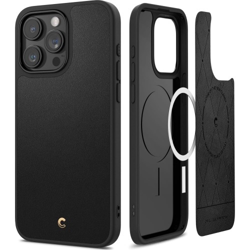 Etui Spigen Cyrill Kajuk Mag Apple iPhone 15 Pro Max Elegancka eko-skóra z MagSafe Hybrydowe etui marki Spigen z serii Cyrill Kajuk Mag, wykonane zostało z połączenia termopoliuretanowej ramki oraz wytrzymałej poliwęglanowej tylnej osłony wykończonej warstwą eleganckiej, syntetycznej eko-skóry PU. Takie połączenie świetnie sprawdzi się w codziennej ochronie urządzenia, a do tego skórzana faktura na pleckach pokrowca nadaje gustownego i ekskluzywnego wyglądu. Dzięki wbudowanemu pierścieniowi magnetycznemu jest kompatybilny z akcesoriami z serii Apple MagSafe. Cyrill to kolejna marka-córka sukcesywnie rozwijającej się firmy Spigen, nastawiona na projektowanie nowych linii wysokiej jakości akcesoriów dla urządzeń gsm. Wszystkie te akcesoria produkowane są z niezwykłą starannością, z zastosowaniem najnowszych technologii i nowoczesnego design'u. *Przedmiotem sprzedaży jest samo etui, pozostałe akcesoria widoczne na zdjęciach służą jedynie przedstawieniu jego funkcjonalności. Kolor producenta: Black Etui kompatybilne ze szkłami o wymiarach mniejszych niż (dług./szer.): 15,91 x 7,44 x 16,62 cm Wzmocniona ochrona Futerał zapewnia wysoką ochronę dzięki zastosowaniu przemyślanych technologii, dających wiele korzyści w codziennym użytkowaniu: chroni tył i boki przed zabrudzeniami i zarysowaniami dzięki zastosowaniu TPU pewnie leży w dłoni technologia poduszek powietrznych w narożnikach Air Cushion® amortyzuje wstrząsy lekko wystające ranty chronią ekran i kamerę na płaskich powierzchniach wnętrze wyłożone warstwą miękkiej mikrofibry dodatkowo chroni plecki urządzenia To zgrabny i lekki cover, który nie dodaje zbędnej objętości, zachowując smukły profil smartfona. Skórzane wykończenie Luksusowego i wystawnego szyku niewątpliwie nadaje staranne wykończenie plecków syntetyczną eko-skórą. Ich elegancka faktura jest przyjemna w dotyku i świetnie imituje skórzany wzór, który od zawsze kojarzy się z ekskluzywnym wyglądem. To doskonały futerał dla tych, którzy lubią wytworną klasykę z zachowaniem minimalistycznej i subtelnej bryły obudowy. Z pełnym dostępem do interfejsów Etui posiada ergonomiczny kształt oraz jest świetnie dopasowane do urządzenia. Zintegrowane osłony na przyciski i wycięcia na porty zapewniają pełen dostęp do interfejsów, oferując wysoki komfort użytkowania. Kompatybilne z serią Apple MagSafe Wewnątrz etui znajduje się wbudowany pierścień magnetyczny zapewniający kompatybilność z akcesoriami z serii Apple MagSafe. Dzięki niemu nadal możesz korzystać z posiadanej ich gamy bez potrzeby zdejmowania pokrowca.