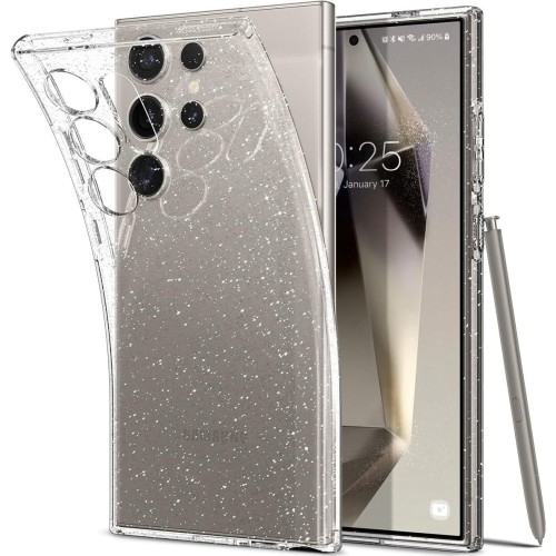 Etui Spigen Liquid Crystal GlitterSamsung Galaxy S24 Ultra Cienki minimalizm z brokatemElastyczne etui z brokatem od marki Spigen z serii Liquid Crystal Glitter to plecki zaprojektowane w sposób, w którym za priorytet wyznaczono przede wszystkim minimalizm oraz subtelną i obłą formę, która zachowa smukły kształt smartfona. Futerał wykonano z miękkiego, lecz mocnego i wytrzymałego termopoliuretanu, który zapewnia dobrą ochronę w codziennym użytkowaniu. Ergonomiczna budowa sprawia, że cover świetnie leży w dłoni oferując wygodny i pewny chwyt. Transparentny design prezentuje oryginalny wygląd Twojego urządzenia, a zatopione w nim mieniące się w świetle drobinki brokatu przyciągają uwagę swoim blaskiem.*Przedmiotem sprzedaży jest samo etui, pozostałe akcesoria widoczne na zdjęciach służą jedynie przedstawieniu jego funkcjonalności.Kolor producenta: Crystal Quartz (przezroczysty z brokatem)Etui kompatybilne ze szkłami o wymiarach mniejszych niż (długość x szerokość): 15,84 x 7,51 cm Lekka i smukła ochronaTo wyjątkowo lekkie i smukłe etui, które nie pogrubia znacznie urządzenia, zapewniając mu codzienną ochronę przed zarysowaniami. Skutecznie chroni tył i boki smartfona, a lekko wystające ranty chronią sekcję aparatów i ekran przed zarysowaniami na płaskich powierzchniach. Dzięki temu Twój wyświetlacz będzie całkowicie bezpieczny podczas odkładania telefonu ekranem w dół, zatem korzystaj swobodnie z gestów wyciszania, oraz nie martw się o swoje obiektywy odkładając telefon na blat biurka. Transparentny designMinimalistyczny design charakteryzuje się przezroczystą budową o długotrwałej przejrzystości, dzięki czemu Twoje urządzenie zyskuje na dodatkowej ochronie, a jednocześnie pozostawia na widoku wiele ze swojego oryginalnego wyglądu.Dodatkowym atutem przezroczystego etui jest możliwość dowolnej personalizacji tej części obudowy, wystarczy wsunąć pod nią ulubione zdjęcia, stickery, itp. by urozmaicić wygląd urządzenia na swój własny i oryginalny sposób.Ponadto specjalnie zaprojektowane wnętrze pokrowca zapobiega jego przywieraniu do urządzenia. Mieniący się brokatNiezwykłego wyglądu nadają błyszczące drobinki brokatu, które bogato połyskują w świetle pod zmianą kąta widzenia. Dzięki temu Twoje urządzenie będzie wyglądało wyjątkowo i stylowo, gdyż tak efektowny akcent nie może nie wzbudzać zainteresowania, i z pewnością będzie przyciągać ukradkowe spojrzenia osób spragnionych mieniących się atrakcji w otoczeniu. Osłony na przyciskiPrecyzyjne wycięcia zapewniają swobodny dostęp do wszystkich interfejsów smartfona, dzięki czemu całość jest niezwykle funkcjonalna i wygodna w użytkowaniu. Cover posiada także zintegrowane osłony na przyciski, które są responsywne i zachowują dobrze wyczuwalne kliknięcie. Wzmocnione narożnikiEtui zapewnia solidną ochronę przy minimalnych gabarytach oraz wadze. Dzięki technologii Air Cushion®, czyli poduszek powietrznych umiejscowionych w narożnikach, skutecznie amortyzuje wstrząsy w tych miejscach. Dobrze trzyma się w dłoniDzięki wykonaniu z elastycznego TPU futerał wygodnie i pewnie leży w dłoni, a do tego łatwo się zakłada jak i zdejmuje.Zastosowany materiał nie zakłóca ładowania bezprzewodowego - dotyczy modeli telefonów wyposażonych w tą technologięTransparentna budowaMieniące się w świetle drobinki brokatuWnętrze zapobiegające przywieraniu do urządzeniaMinimalistyczny i smukły wyglądPowyższe zalety pokrowca Liquid Crystal Glitter z pewnością przypadną do gustu każdemu, kto szuka prostej, cienkiej, lecz wytrzymałej obudowy na swoje urządzenie, urozmaiconej połyskliwym brokatem.