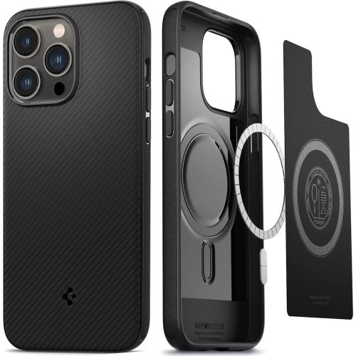 Etui Spigen Mag Armor Apple iPhone 14 Pro Max Wysoka ochrona + MagSafe Nowoczesny futerał od marki Spigen z serii Mag Armor. Hybrydowe etui o matowym wykończeniu, wykonane z połączenia termoplastycznego poliuretanu oraz poliwęglanu zapewnia doskonałą ochronę na wysokim poziomie. Dzięki wbudowanemu pierścieniowi magnetycznemu pokrowiec jest kompatybilny z akcesoriami z serii Apple MagSafe. Kolor producenta: Matte Black Etui kompatybilne ze szkłami o wymiarach nieprzekraczających (dług./szer./przek.): 15,79 x 7,51 x 16,76 cm Hybrydowa konstrukcja PC+TPU Hybrydowa konstrukcja PC+TPU w połączeniu z zastosowanymi technologiami i certyfikatami pozwala skutecznie chronić urządzenie przed zarysowaniami i uszkodzeniem, zapewniając bezpieczeństwo smartfona podczas jego użytkowania. Military Grade - etui spełnia wojskowe standardy odporności Air Cushion Technology - poduszki powietrzne w narożnikach świetnie amortyzują wstrząsy od uderzeń i upadków Lekko podwyższone ranty - chronią aparat i wyświetlacz na płaskich powierzchniach Kompatybilne z serią Apple MagSafe Wewnątrz etui znajduje się wbudowany pierścień magnetyczny zapewniający kompatybilność z akcesoriami z serii Apple MagSafe. Dzięki niemu nadal możesz korzystać z posiadanej ich gamy bez potrzeby zdejmowania pokrowca. Wbudowany pierścień magnetyczny Należy mieć na uwadze, że z biegiem czasu na obudowie może pojawić się delikatny, okrągły odcisk w miejscu pierścienia, spowodowany oddziaływaniem magnesów. Jest to naturalne zjawisko niepodlegające gwarancji. Swobodny dostęp do interfejsów Precyzyjne wycięcia i doskonale zintegrowane osłony na przyciski zapewniają swobodny dostęp do wszystkich interfejsów. Etui jest niezwykle funkcjonalne i wygodne w użytkowaniu, świetnie komponując się z telefonem. Smukła i lekka konstrukcja Spigen Mag Armor to pokrowiec o lekkiej i smukłej budowie, który zachowuje oryginalne kształty urządzenia bez dodawania zbędnej objętości. Wygodnie i pewnie leży w dłoni, a matowa powierzchnia minimalizuje pozostawianie odcisków palców czy innych zabrudzeń.