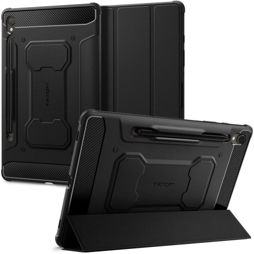 Etui Spigen Rugged Armor Pro Samsung Galaxy Tab S9 (SM-X716B, SM-X710) Hybrydowy cover z klapką Pancerne etui od marki Spigen z serii Rugged Armor Pro to jeden z najpopularniejszych wyborów wśród kupujących, cieszący się świetnymi opiniami wśród jego użytkowników. Obudowę wykonano z połączenia wysokiej jakości termoplastycznego poliuretanu oraz trwałego poliwęglanu. Hybrydowy pokrowiec z klapką o pleckach urozmaiconych stylowymi akcentami na wzór karbonu, zapewnia solidną ochronę, atrakcyjny wygląd oraz dobry chwyt. Ponadto posiada wygodny uchwyt na rysik S-Pen. *Przedmiotem sprzedaży jest samo etui, pozostałe akcesoria widoczne na zdjęciach służą jedynie przedstawieniu jego funkcjonalności. Kolor producenta: Black Etui kompatybilne ze szkłami o wymiarach mniejszych niż (długość x szerokość): 25,28 x 16,42 cm Nowoczesny design Hybrydowe etui Rugged Armor Pro z klapką z magnetycznym zamykaniem doskonale zabezpieczy urządzenie przed zarysowaniami. Cover pomimo pancernego stylu nadal zachowuje dość smukły profil urządzenia, zachowując jego eleganckie kształty. Stylowy design o matowym wykończeniu został urozmaicony akcentami o wzorze karbonu, nadając mu tym samym nowoczesnego wyglądu. Pozwoliło to osiągnąć efekt nieprzeciętnej obudowy z doskonale wkomponowanymi detalami przykuwającymi uwagę. Funkcjonalna klapka Futerał dobrze leży w dłoni, a lekko wystające krawędzie chronią kamerę i ekran przed zarysowaniami na płaskich powierzchniach. Wnętrze klapki zostało wykończone delikatną eko-skórą PU Velo, która stanowi dodatkowe zabezpieczenie dla ekranu. Swobodna obsługa tabletu Pokrowiec zapewnia swobodny dostęp do wszystkich interfejsów urządzenia, dzięki dopasowanym osłonom na przyciski oraz wycięciom na porty. Całość jest niezwykle funkcjonalna i wygodna w użytkowaniu i świetnie trzyma się w dłoni. Dwupoziomowa funkcja Stand Dzięki składanej klapce możliwe jest ułożenie urządzenia w wygodnej pozycji zarówno do pisania czy rysowania, jak i do swobodnego przeglądania multimediów, co pozwoli Ci ułożyć tablet pod odpowiednim kątem w zależności od Twoich potrzeb. Wzmocniona konstrukcja Dzięki technologii Air Cushion, czyli poduszek powietrznych umiejscowionych w narożnikach zapewnia dodatkową ochronę od wstrząsów przy niewielkich gabarytach oraz wadze. Uchwyt na rysik Ten model etui posiada specjalnie zaprojektowany uchwyt na rysik, pozwalający przechowywać go razem z tabletem. Budowa slotu na wcisk znajduje się w dedykowanym miejscu tabletu, dzięki czemu zachowuje on pełną funkcjonalność S-Pen'a, a także stanowi dodatkowe zabezpieczenie dla samego rysika przed przypadkowym wypadnięciem.