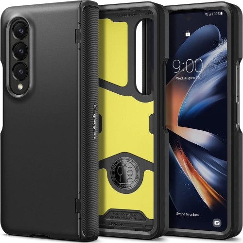 Etui Spigen Slim Armor Pro Samsung Galaxy Z Fold4 Smukły, pancerny design Stylowe etui od marki Spigen z serii Slim Armor Pro wyróżniające się trójwarstwową budową o smukłym, zaokrąglonym profilu. Do tego wyposażone jest w zintegrowaną osłonę chroniącą zawias Twojego składanego smartfona. Hybrydowy cover łączy w sobie wewnętrzną warstwę z termoplastycznego poliuretanu oraz zewnętrzny panel z twardego poliwęglanu. Dodatkowo wnętrze zostało uzupełnione o cienką warstwę pianki redukującej wstrząsy, jednak pomimo pancernej konstrukcji obudowa zachowuje stylowy wygląd i doskonale się prezentuje w codziennym użytkowaniu. *Przedmiotem sprzedaży jest samo etui, pozostałe akcesoria widoczne na zdjęciach służą jedynie przedstawieniu jego funkcjonalności. Kolor producenta: Black Wzmocniona ochrona: PC + TPU + pianka Zastosowana technologia Air Cushion® - czyli poduszki powietrzne w narożnikach, oraz cienka warstwa specjalnej pianki wewnątrz w połączeniu z hybrydową budową pokrowca stanowią korzystny zestaw ochronny dla Twojego urządzenia, który zdecydowanie polepsza amortyzację wstrząsów, by jeszcze lepiej zabezpieczyć Twój telefon przed zarysowaniami i skutkami od uderzeń. Niezwykle lekka pianka stanowi dodatkową warstwę ochronną, świetnie rozpraszając wstrząsy, i nie dodając przy tym zbędnej wagi pokrowcowi, co w połączeniu z pozostałymi zaletami sprawia, że futerał z powodzeniem spełnia wymogi standardu odporności Mil-Grade. Ochrona na zawias Semi-Auto Sliding Tech - etui na łączeniu zostało wyposażone w dopasowaną i funkcjonalną osłonkę, która chroni zawias Twojego telefonu przed zarysowaniami, dzięki czemu doskonale współgra z całym urządzeniem. Lekka i smukła budowa To wyjątkowo lekkie i smukłe etui, które nie dodaje zbędnej wagi urządzeniu, zapewniając mu codzienną ochronę przed zarysowaniami. Skutecznie chroni tył i boki smartfona, a lekko wystające ranty chronią sekcję aparatów i ekran przed zarysowaniami na płaskich powierzchniach. Dzięki temu Twój wyświetlacz będzie całkowicie bezpieczny podczas odkładania telefonu ekranem w dół, zatem korzystaj swobodnie z gestów wyciszania, oraz nie martw się o swoje obiektywy odkładając telefon na blat biurka. Wycięcia na przyciski Precyzyjne wycięcia na sekcję przycisków i porty zapewniają swobodny dostęp do wszystkich interfejsów smartfona, dzięki czemu całość jest niezwykle funkcjonalna i wygodna w użytkowaniu. Dobrze trzyma się w dłoni Dzięki ramce z TPU futerał wygodnie i pewnie leży w dłoni, a do tego łatwo się zakłada jak i zdejmuje. Zastosowany materiał nie zakłóca ładowania bezprzewodowego - dotyczy modeli telefonów wyposażonych w tą technologię.