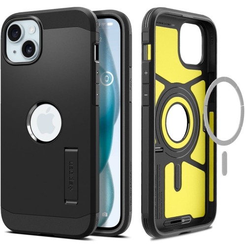 Etui Spigen Tough Armor Mag Apple iPhone 15 Pancerna konstrukcja z MagSafe Świetna pozycja od marki Spigen z serii Tough Armor Mag cechująca się wysoką wytrzymałością, a jednocześnie sporym komfortem użytkowania dzięki wbudowanemu pierścieniowi magnetycznemu, który sprawia, że pokrowiec jest kompatybilny z akcesoriami z serii Apple MagSafe. Ponadto wbudowana podstawka KickStand po rozłożeniu pozwala ustawić telefon w pozycji horyzontalnej dla wygodniejszego przeglądania multimediów. Hybrydowe etui łączy w sobie wewnętrzną warstwę z termoplastycznego poliuretanu oraz zewnętrzny panel z twardego poliwęglanu. Dodatkowo wnętrze zostało uzupełnione o cienką warstwę pianki redukującej wstrząsy, jednak pomimo pancernej konstrukcji obudowa zachowuje stylowy wygląd i doskonale się prezentuje w codziennym użytkowaniu. *Przedmiotem sprzedaży jest samo etui, pozostałe akcesoria widoczne na zdjęciach służą jedynie przedstawieniu jego funkcjonalności. Kolor producenta: Black (czarny) Etui kompatybilne ze szkłami o wymiarach mniejszych niż (długość x szerokość): 14,40 x 6,85 cm Wzmocniona ochrona: PC + TPU + pianka Zastosowana technologia Air Cushion® - czyli poduszki powietrzne w narożnikach, oraz cienka warstwa specjalnej pianki wewnątrz w połączeniu z hybrydową budową pokrowca stanowią korzystny zestaw ochronny dla Twojego urządzenia, który zdecydowanie polepsza amortyzację wstrząsów, by jeszcze lepiej zabezpieczyć Twój telefon przed zarysowaniami i skutkami od uderzeń. Niezwykle lekka pianka stanowi dodatkową warstwę ochronną, świetnie rozpraszając wstrząsy, i nie dodając przy tym zbędnej wagi pokrowcowi, co w połączeniu z pozostałymi zaletami sprawia, że futerał z powodzeniem spełnia wymogi standardu odporności Mil-Grade. Kompatybilne z serią Apple MagSafe Wewnątrz etui znajduje się wbudowany pierścień magnetyczny zapewniający kompatybilność z akcesoriami z serii Apple MagSafe. Dzięki niemu nadal możesz korzystać z posiadanej ich gamy bez potrzeby zdejmowania pokrowca. Funkcjonalna nóżka Wbudowana podstawka w postaci rozkładanej nóżki KickStand pozwala na swobodne przeglądanie multimediów w wygodnej pozycji horyzontalnej, uwalniając Twoje ręce od ciągłego trzymania smartfona w dłoni. Stojak łatwo się rozkłada i zamyka, jest wygodny w obsłudze i z pewnością doda funkcjonalności Twojemu urządzeniu. Lekka ochrona To wyjątkowo lekkie etui, które nie dodaje zbędnej wagi urządzeniu, zapewniając mu codzienną ochronę przed zarysowaniami. Skutecznie chroni tył i boki smartfona, a lekko wystające ranty chronią sekcję aparatów i ekran przed zarysowaniami na płaskich powierzchniach. Dzięki temu Twój wyświetlacz będzie całkowicie bezpieczny podczas odkładania telefonu ekranem w dół, zatem korzystaj swobodnie z gestów wyciszania, oraz nie martw się o swoje obiektywy odkładając telefon na blat biurka. Osłony na przyciski Precyzyjne wycięcia zapewniają swobodny dostęp do wszystkich interfejsów smartfona, dzięki czemu całość jest niezwykle funkcjonalna i wygodna w użytkowaniu. Cover posiada także zintegrowane osłony na przyciski, które są responsywne i zachowują dobrze wyczuwalne kliknięcie. Dobrze trzyma się w dłoni Dzięki ramce z TPU futerał wygodnie i pewnie leży w dłoni, a do tego łatwo się zakłada jak i zdejmuje. Zastosowany materiał nie zakłóca ładowania bezprzewodowego - dotyczy modeli telefonów wyposażonych w tą technologię.