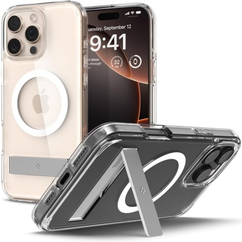 Etui Spigen Ultra Hybrid S MagApple iPhone 16 Pro Hybrydowa konstrukcja z podstawką i z MagSafeHybrydowe etui od marki Spigen z serii Ultra Hybrid S Mag to pokrowiec, którego wyjątkowość stanowi sprytny dodatek w postaci wbudowanej podstawki KickStand. Jej rozłożenie pozwala ustawić telefon w pozycji horyzontalnej dla wygodniejszego przeglądania multimediów. Cover wykonany został z połączenia termoplastycznej poliuretanowej ramki oraz wytrzymałej poliwęglanowej tylnej osłony. Jednoczęściowa konstrukcja typu "plecki" zapewnia doskonałą ochronę w codziennym użytkowaniu. Ergonomiczna budowa sprawia, że całość świetnie leży w dłoni oferując wygodny i pewny chwyt. Smukły design z przezroczystym tyłem prezentuje oryginalny wygląd Twojego urządzenia.Ponadto zintegrowany pierścień magnetyczny sprawia, że pokrowiec jest kompatybilny z akcesoriami z serii Apple MagSafe.*Przedmiotem sprzedaży jest samo etui, pozostałe akcesoria widoczne na zdjęciach służą jedynie przedstawieniu jego funkcjonalności.Kolor producenta: Crystal Clear (kolor etui: przezroczysty / kolor ramki: przezroczysty / kolor pierścienia: biały / kolor podstawki: srebrny)Etui kompatybilne ze szkłami o wymiarach mniejszych niż (długość x szerokość): 14,71 x 6,90 cm  Lekka i smukła ochronaTo wyjątkowo lekkie i smukłe etui, które nie pogrubia znacznie urządzenia, zapewniając mu codzienną ochronę przed zarysowaniami. Skutecznie chroni tył i boki smartfona, a lekko wystające ranty chronią sekcję aparatów i ekran przed zarysowaniami na płaskich powierzchniach. Dzięki temu Twój wyświetlacz będzie całkowicie bezpieczny podczas odkładania telefonu ekranem w dół, zatem korzystaj swobodnie z gestów wyciszania, oraz nie martw się o swoje obiektywy odkładając telefon na blat biurka.  Transparentny designStylowy design charakteryzuje się przezroczystym panelem na pleckach o długotrwałej przejrzystości, dzięki czemu Twoje urządzenie zyskuje na dodatkowej ochronie, a jednocześnie pozostawia na widoku wiele ze swojego oryginalnego wyglądu.Dodatkowym atutem przezroczystego tyłu jest możliwość dowolnej personalizacji tej części obudowy, wystarczy wsunąć pod nią ulubione zdjęcia, stickery, itp. by urozmaicić wygląd urządzenia na swój własny i oryginalny sposób.  Funkcjonalna nóżkaWbudowana podstawka w postaci rozkładanej nóżki KickStand pozwala na swobodne przeglądanie multimediów w wygodnej pozycji horyzontalnej, uwalniając Twoje ręce od ciągłego trzymania smartfona w dłoni. Stojak łatwo się rozkłada i zamyka, jest wygodny w obsłudze i z pewnością doda funkcjonalności Twojemu urządzeniu.  Kompatybilne z serią Apple MagSafeWewnątrz etui znajduje się wbudowany pierścień magnetyczny zapewniający kompatybilność z akcesoriami z serii Apple MagSafe. Dzięki niemu nadal możesz korzystać z posiadanej ich gamy bez potrzeby zdejmowania pokrowca.  Osłony na przyciskiPrecyzyjne wycięcia zapewniają swobodny dostęp do wszystkich interfejsów smartfona, dzięki czemu całość jest niezwykle funkcjonalna i wygodna w użytkowaniu. Cover posiada także zintegrowane osłony na przyciski, które są responsywne i zachowują dobrze wyczuwalne kliknięcie.  Wzmocnione narożnikiEtui zapewnia solidną ochronę przy minimalnych gabarytach oraz wadze podczas upadków. Dzięki technologii Air Cushion®, czyli poduszek powietrznych umiejscowionych w narożnikach, skutecznie amortyzuje wstrząsy od upadków, spełniając wymogi standardu odporności Mil-Grade.  Dobrze trzyma się w dłoniDzięki ramce z TPU futerał wygodnie i pewnie leży w dłoni, a do tego łatwo się zakłada jak i zdejmuje. Zastosowany materiał nie zakłóca ładowania bezprzewodowego - dotyczy modeli telefonów wyposażonych w tą technologię.