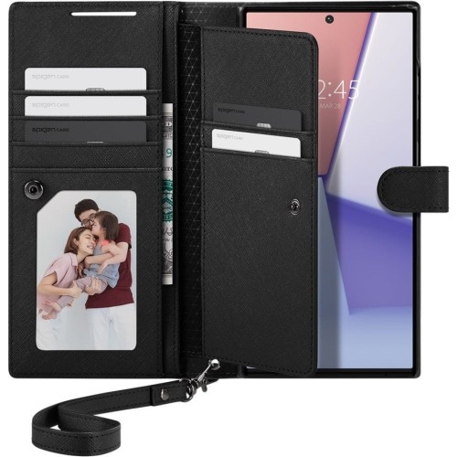 Etui Spigen Wallet S Plus Samsung Galaxy S23 Ultra Portfelowe etui z eko-skóry Eleganckie etui portfelowe od marki Spigen z serii Wallet S Plus, w którym oprócz dedykowanego smartfona zmieścisz także wiele podręcznych akcesoriów, takich jak karty bankowe, zdjęcia rodzinne, dokumenty, banknoty, itp. Wersja "plus" charakteryzuje się zwiększoną ilością slotów i schowków na przedmioty, spełniając oczekiwania tych, którzy oczekują pojemniejszych futerałów o budowie typu "Wallet". Obudowa wykonana została z mocnego i solidnego poliwęglanu, a całość wykończona została stylową eko-skórą PU o drobnym wzorze saffiano. Ergonomiczna konstrukcja z dopinaną smyczą nadgarstkową sprawiają, że całość świetnie i bezpiecznie leży w dłoni oferując wygodny i pewny chwyt. *Przedmiotem sprzedaży jest samo etui, pozostałe akcesoria widoczne na zdjęciach służą jedynie przedstawieniu jego funkcjonalności. Etui kompatybilne ze szkłami o wymiarach nieprzekraczających (dług./szer./przek.): 16,15 x 7,35 x 17,75 cm Kolor producenta: Black Dostęp do interfejsów Precyzyjne wycięcia zapewniają swobodny dostęp do wszystkich interfejsów smartfona, dzięki czemu całość jest niezwykle funkcjonalna i wygodna w użytkowaniu. Lekko wystające ranty chronią sekcję aparatów przed zarysowaniami na płaskich powierzchniach. Dzięki temu nie musisz martwić się o swoje obiektywy odkładając telefon na blat biurka. Etui, które zastępuje portfel Portfelowa budowa z dodatkową wkładką wewnątrz zapewnia zwiększone możliwości dla używania schowków i slotów na podręczne akcesoria. Z łatwością przeniesiesz do nich swoje najważniejsze karty bankowe, osobiste dokumenty, banknoty, czy zdjęcia najbliższych. Bezpieczne zamykanie na zatrzask zapewnia solidną ochronę przechowywanej zawartości. Przykładaj i płać bez zwłoki Koniec z przeglądaniem portfela i szukaniem karty bankowej w kolejce sklepowej! Dzięki tylnej kieszonce, w której umieszczasz najczęściej używaną kartę płatniczą, wystarczy przyłożyć telefon do czytnika w sklepie i możesz spokojnie zająć się pakowaniem zakupów.