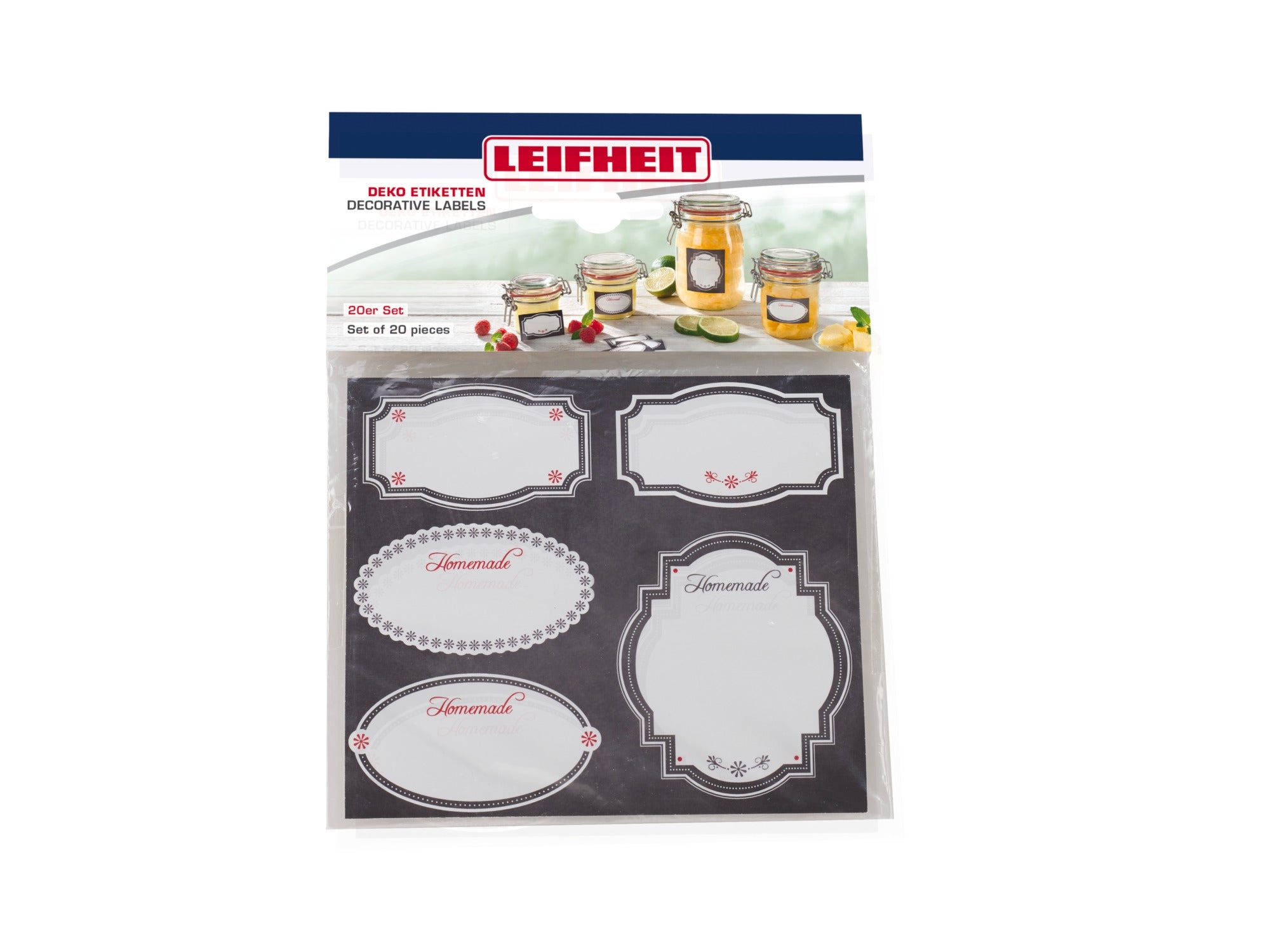 Dzięki etykietom dekoracyjnym na słoiki i butelki marki Leifheit szybko i wygodnie ozdobimy domowej roboty przysmaki, które znajdą się na kuchennych półkach lub będą gustownymi prezentami na każda okazję. W zestawie znajduje się 20 sztuk etykiet w czarno-białym kolorze i stylistyce vintage. Różna wielkość etykiet pozwala na umieszczanie ich zarówno na małych słoiczkach, jak i dużych butelkach. Pisanie po nich jest bardzo wygodne. Niektóre etykiety posiadają naniesiony fabrycznie napis „Homemade” (tłum. „domowej roboty”). Są samoprzylepne – umieszczanie ich na gładkich powierzchniach jest bardzo proste, a klej trzyma mocno nawet po dłuższym czasie.