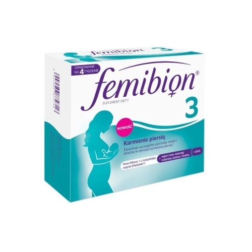 Suplement diety Femibion 3 Karmienie piersią przeznaczony do stosowania jako uzupełnienie codziennej diety dla matek karmiących piersią w składniki takie jak np. kwas DHA, foliany, witamina D, witaminy z grupy B.