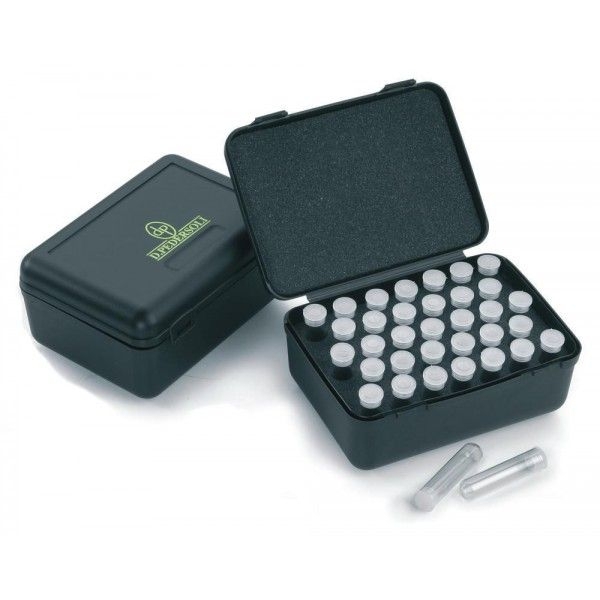Zestaw 33 szklanych flakoników do prochu w plastikowej walizeczce z gąbczastą wyściółką. Pojemność flakonika ok. 110 grs.