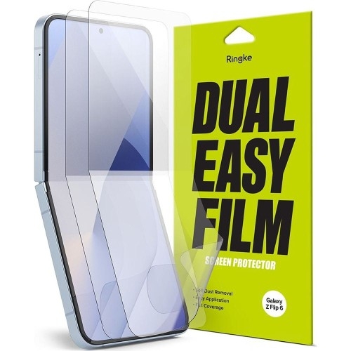 Ringke Dual Easy Film Screen Protector 2-Pack Samsung Galaxy Z Flip6 Folia kompatybilna z etui Rewelacyjna folia ochronna marki Ringke. Doskonale dopasowana dla idealnego współgrania z etui. Wysokiej jakości folia ochroni wyświetlacz przed zarysowaniami i zabrudzeniem. Powłoka oleofobowa i hydrofobowa zapobiega pozostawianiu odcisków palców i smug pomagając w utrzymaniu czystości ekranu. *Przedmiotem sprzedaży jest zestaw dwóch folii na ekran wewnętrzny wraz z zestawem instalacyjnym, pozostałe akcesoria, widoczne na zdjęciach służą jedynie przedstawieniu funkcjonalności produktu. Kompozyt warstw ochronnych Hydrożelowa folia ochronna Ringke wykonana została z kompozytu 4 warstw zapewniając: wysoką czułość ekranu dotykowego pełną ochronę wyświetlacza urządzenia pełną przezroczystość łatwa aplikacja bez bąbelków powietrza gładkość w dotyku i doskonałe przyleganie osłona przed kurzem i zanieczyszczeniami Folia stanowi dodatkową ochronę przed zarysowaniem ekranu smartfona. Posiada wszelkie niezbędne wycięcia, a oleofobowa powłoka ułatwia utrzymanie w czystości wyświetlacza bez zbędnych odcisków palca oraz tłustych plam. Precyzja wykonania Precyzyjnie wycięta, doskonale pokrywa całą powierzchnię wyświetlacza z małym marginesem dla dopasowania z etui. Zachowuje doskonałą czułość reagowania ekranu. Dodatkowo posiada wycięcie na przedni aparat. Łatwy montaż Załączony zestaw aplikacyjny i zastosowanie ponumerowanych naklejek zabezpieczających, odklejanych krok po kroku sprawia, że montaż folii przebiega bardzo łatwo i sprawnie. Naklejki pomagają idealnie wypozycjonować folię na urządzeniu w celu dokładnego przylegania. *zdjęcie poglądowe