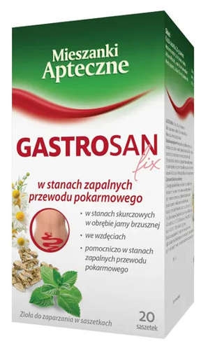 Mieszkanka ziołowa Gastrosan stosowana jest w: stany zapalne przewodu pokarmowego, choroba wrzodowa żołądka i dwunastnicy. Leczenie pomocnicze zaburzeń wydzielniczych i ruchowych przewodu pokarmowego.