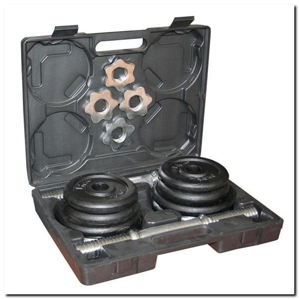 Komplet umożliwia złożenie dwóch hantli o maksymalnej wadze 10 kilogramów każda. Stalowe gryfy mają długość 35 centymetrów i gwintowane końcówki o średnicy 30 milimetrów. Każdy z nich został także wyposażony w ryflowany chwyt, gwarantujący, że hantle nie wyślizgną się ze spoconych dłoni. Osadzanie talerzy odbywa się w bardzo prosty sposób – wystarczy wsunąć je na koniec gryfu i docisnąć z pomocą dołączonych nakrętek.