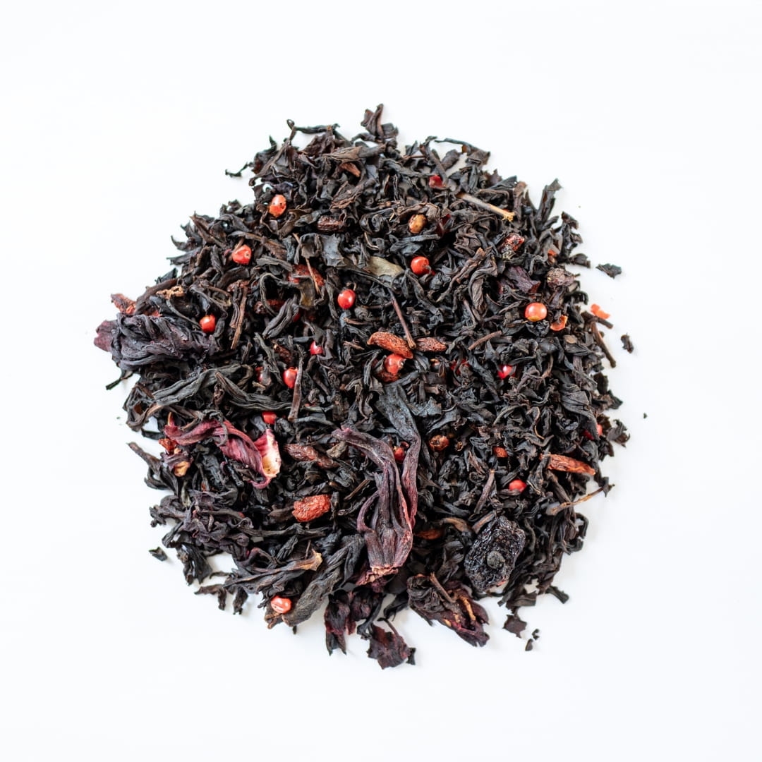 Herbata czarna JAGODY GOJI I WINOGRONA Herbata czarna JAGODY GOJI I WINOGRONA - skład Herbata czarna indyjska OP, suszone ciemne winogrona, kwiaty hibiskusa, jagody Goji, kuleczki czerwonego pieprzu, aromat. Herbata czarna JAGODY GOJI I WINOGRONA - cechy produktu: Czas parzenia: 3-5 minut Temperatura wody: 95 stopni Waga netto: 100 g Herbata wysokiej jakości Zapakowana w praktyczne i eleganckie czarne opakowanie Herbaty liściaste i zioła - jak pakujemy? Nasze herbaty liściaste, mieszanki owocowe i zioła pakujemy po 100g. Trafiają do Ciebie w szczelnie zamkniętym, czarnym opakowaniu, które jest przystosowane do kontaktu z żywnością. Ma zamknięcie strunowe, które pozwala na wielokrotne otwieranie i zamykanie opakowania. W naszych opakowaniach możesz przechowywać herbatę i zioła bez obaw, że wywietrzeją lub rozsypią się po otwarciu. Na każdym opakowaniu jest etykieta, z której dowiesz się: jaką herbatę lub mieszankę ziołową zawiera opakowanie jaki jest skład herbaty jaki jest termin przydatności do spożycia jaką wodą oraz jak długo trzeba parzyć daną herbatę Rodzaj herbaty (czarna, zielona, Pu erh, owocowa itd.) oznaczyliśmy kolorami, dzięki czemu łatwiej będzie znaleźć odpowiedni rodzaj, jeśli masz duże zapasy herbat i przechowujesz je w naszych opakowaniach.