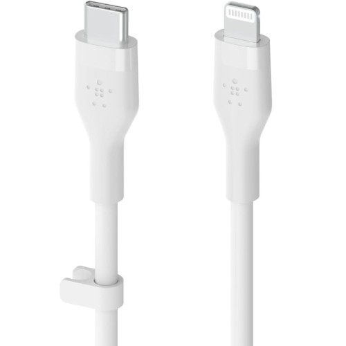 Belkin Boost↑Charge Flex Silicone USB-C PD to Lightning Cable USB-C do Lightning / iPhone / iPad   Wysoka jakość wykonania Oryginalny kabel ładujący i synchronizujący dane marki Belkin z serii Boost↑Charge z solidną i elastyczną osłoną z miękkiego silikonu, przeznaczony dla urządzeń z portem Lightning. Można go używać zarówno do ładowania z ładowarką sieciową, samochodową jak i jako kabel połączeniowy z komputerem, czy stacjami dokującymi. Długość kabla: 2m Kolor producenta: White     Silikonowa powłoka Miękkie i przyjemnie w dotyku silikonowe wykończenie zapewnia wyjątkową giętkość kabla, przy jednoczesnym zapewnieniu długotrwałej wytrzymałości w codziennym użytkowaniu. Elastyczny silikon charakteryzuje się mniejszą podatnością na skręcanie się konstrukcji przewodu, splątanie lub jego załamanie. Dołączony organizer w formie klipsa oferuje wygodniejsze zarządzanie kablem jak i jego uporządkowane przechowywanie.       Przesyłanie danych oraz ładowanie Wykonany z wysokiej jakości materiałów kabel Belkin Boost↑Charge może być używany do ładowania urządzeń jak i do synchronizacji danych. Przeznaczony dla urządzeń Apple portem Lightning, jak iPhone czy iPad. Kabel jest dość giętki i łatwo się przechowuje, dzięki czemu możesz zawsze mieć go przy sobie. Wystarczy, że podłączysz go do źródła zasilania, by naładować swoje urządzenia Apple czy to w domu, w biurze czy w podróży. Parametry: Power Delivery 3A / 20W       Wzmocnione końcówki Wzmocniona budowa końcówek kabla w połączeniu z silikonem zapewnia większą elastyczność przy ewentualnym ruchu kabla i minimalizuje ryzyko pęknięcia lub uszkodzenia, zwiększając jego ogólną trwałość w tym szczególnie narażonym na uszkodzenia miejscu. Producent zapewnia, że Belkin Flex jest 25x wytrzymalszy od zwykłego kabla - po przeprowadzeniu wewnętrznych testów laboratoryjnych wytrzymał on aż 25'000 zgięć w porównaniu do 1'000 zgięć jakie osiągnął przeciętny kabel PVC.       Bezpieczeństwo użytkowania Certyfikat MFI oznacza zgodność z wymogami producenta Apple w celu spełnienia wszystkich standardów wydajnościowych jak i bezpieczeństwa podłączonych urządzeń. Certyfikat USB-IF zapewnia zgodność z technologią Hi-Speed USB. Oznacza to, że kabel został certyfikowany przez USB-IF w celu spełnienia wszelkich wymaganych standardów elektrycznych, mechanicznych i środowiskowych.