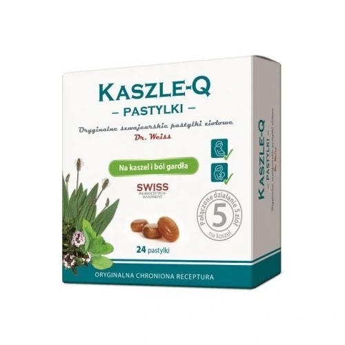 Wyrób medyczny Kaszle-Q Pastylki do ssania przeznaczony jest do stosowania wspomagająco w łagodzeniu takich objawów przeziębienia jak ból gardła, chrypka, suchy i mokry kaszel. W składzie pastylek zawarto np. ekstrakt z babki lancetowatej i bazylii.