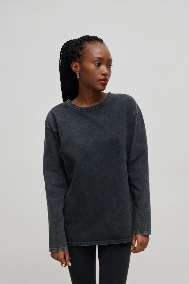 Longsleeve ONYX wykonany jest z przyjemnej w dotyku bawełny w kolorze spranej szarości . Posiada półokrągły dekolt, długie rękawy oraz gładki tył i przód. Ten fason można zestawić na wiele różnych sposobów, tworząc różnorodne stylizacje. Dzięki swojej uniwersalności. Można go nosić solo, łącząc go na przykład z jeansową spódnicą lub spodniami z wysokim stanem. Może być również świetnym elementem podkładającym pod kurtkę lub sweter w chłodniejsze dni. Można go także zestawić z eleganckimi spodniami o kroju cygaretek lub ołówkowymi spódnicami, dodając obcasy lub czółenka, aby uzyskać bardziej formalny look. Dodatkowo, można go uzupełnić różnymi akcesoriami, takimi jak biżuteria czy apaszka, aby stworzyć jeszcze bardziej unikatową stylizację. Modelka ma 169 cm wzrostu i prezentuje rozmiar S/M . Skład: 100% Bawełna ZALECANA PIELĘGNACJA :