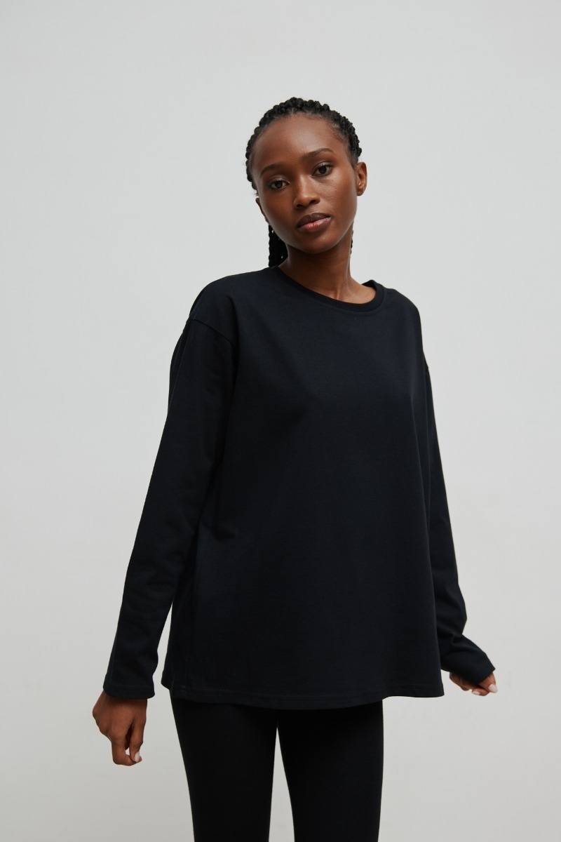 Longsleeve ONYX wykonany jest z przyjemnej w dotyku bawełny w czarnym kolorze . Posiada półokrągły dekolt, długie rękawy oraz gładki tył i przód. Ten fason można zestawić na wiele różnych sposobów, tworząc różnorodne stylizacje. Dzięki swojej prostocie i uniwersalności, top ten będzie pasować zarówno do casualowych, codziennych outfitów, jak i bardziej eleganckich i formalnych looków. Można go nosić solo, łącząc go na przykład z jeansową spódnicą lub spodniami z wysokim stanem. Może być również świetnym elementem podkładającym pod kurtkę lub sweter w chłodniejsze dni. Można go także zestawić z eleganckimi spodniami o kroju cygaretek lub ołówkowymi spódnicami, dodając obcasy lub czółenka, aby uzyskać bardziej formalny look. Dodatkowo, można go uzupełnić różnymi akcesoriami, takimi jak biżuteria czy apaszka, aby stworzyć jeszcze bardziej unikatową stylizację. Ten model jest wszechstronnym elementem garderoby, który można zestawić na wiele różnych sposobów, tworząc zarówno codzienne, casualowe outfity, jak i bardziej eleganckie i formalne stylizacje. Modelka ma 169 cm wzrostu i prezentuje rozmiar S/M . Skład: ZALECANA PIELĘGNACJA :